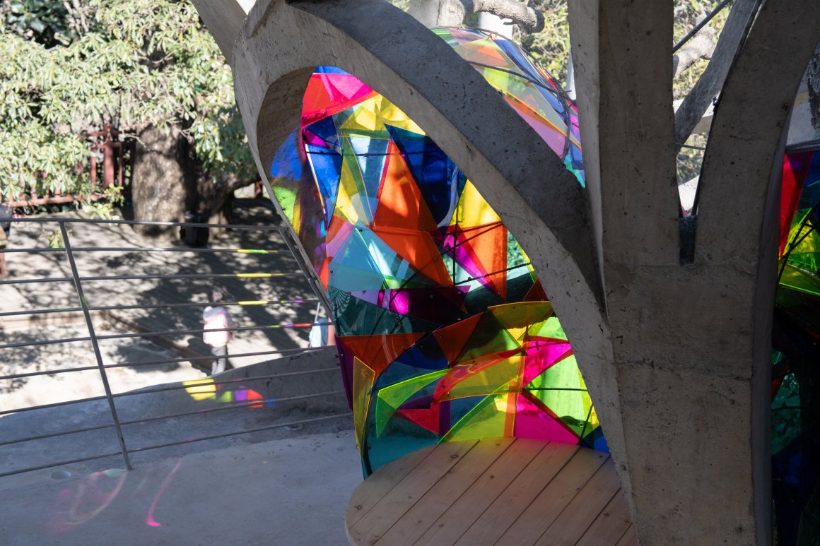 小小的书屋是一个光的容器。为拐枣树的生长保留树洞,中心采光圆洞,为减轻屋檐重量而预留的圆洞,楼梯空间,都为建筑带来了变化丰富的自然光线。柱子的拱形结构和树枝状结构,也给建筑生成了丰富的光影效果。拱形柱网投射枝桠状阴影,与彩色亚克力书架(6mm螺纹钢编织半圆球体)折射的斑斓光斑,在地面交织成童趣光域。倾斜曲面矮墙成为孩童躺卧观日光的剧场坐席,他们席地而躺,等着中心的阳光洒下来打在脸上或身上,光影随时间流转在空间内上演“自然戏剧”。