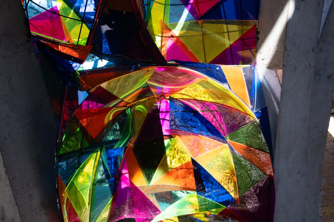 书屋里藏着彩色的梦幻空间。我们沿着拱柱做了一个彩色的书架,书架适应孩子身高,由6毫米的螺纹钢编织而成的半圆球体构成,表面镶嵌彩色亚克力板,透光性强,色彩鲜艳,像这片土地开出的鲜艳花朵。孩子们把它当成大玩具,钻进圆洞里,或享受一个人的安静阅读,或追逐书架上投下的光斑,这里就是他们的乐园。因为有了光,小小的书屋成为一个时空交织的梦幻剧场。