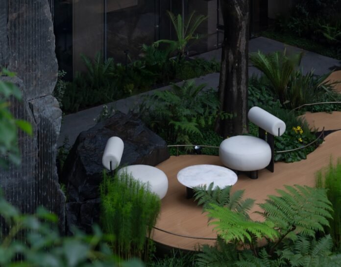 The sunken courtyard landscape draws inspiration from the Classic of Mountains and Seas: Western Mountains, which describes ‘Jade Mountain, the abode of the Queen Mother of the West, encircled by pools of colour, rugged with towering rocks, where auspicious clouds drift and misty vapours swirl – a realm of wonder and exquisite beauty.’ The courtyard is bordered on all sides by communal residential facilities. The site features a natural terraced elevation difference of nearly 12 metres from the sunken courtyard to the building’s elevated ground level, providing a natural framework for sculpting a three-dimensional landscape.