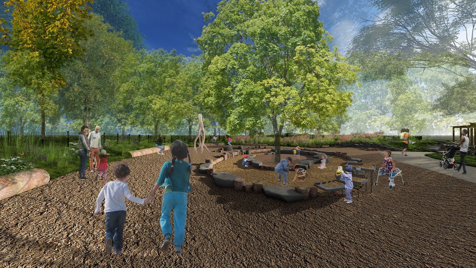 Construction was stalled by the pandemic. Moving forward, a nature exploration area in the center of the Vale will be composed of “tree stumps, logs, and boulders configured for walking, jumping, balancing, sitting and playing,” Prospect Park Alliance stated.