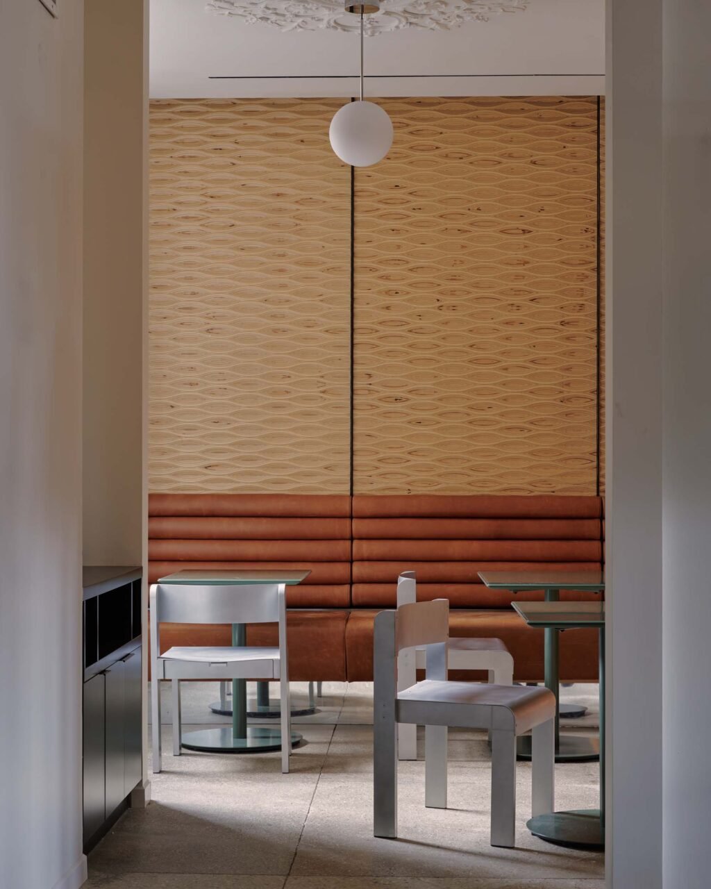 Another built-in bench was installed in the Work Lounge, its design features a leather back tufted into five horizontal sections. The seating is located below a textured wall backdrop with a subtle wavy pattern. Chunky steel OTSxBestcase Sturdy Chairs offer additional seating.