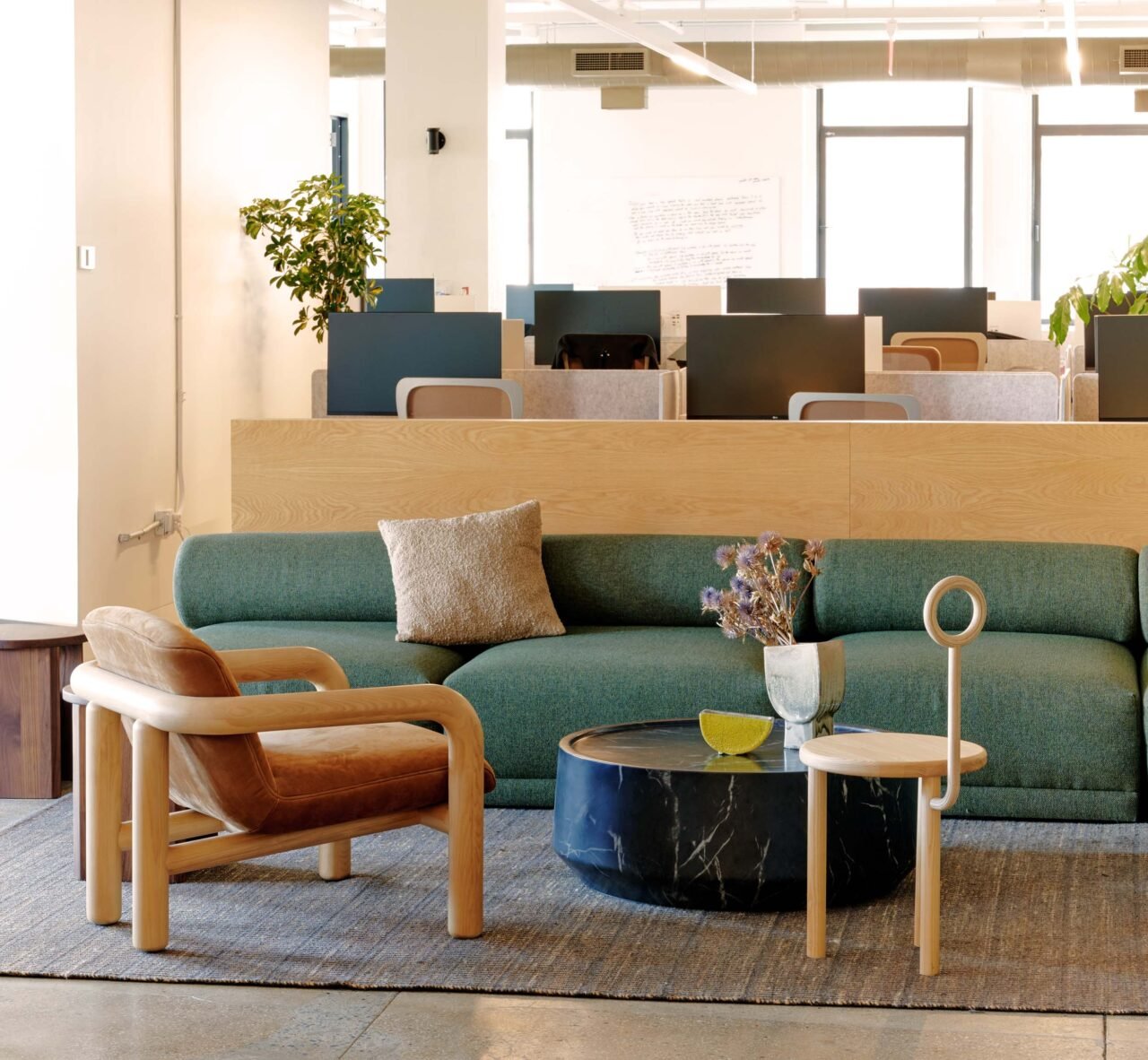 In the All Hands Lounge, sturdy black marble coffee tables are centrally placed among the curved West Elm Benson Leather Chairs and the dark forest green sectional couches by Lulu and Georgia. Additional gathering spaces are formed from the lounge furniture staged on brown Moroccan rugs.