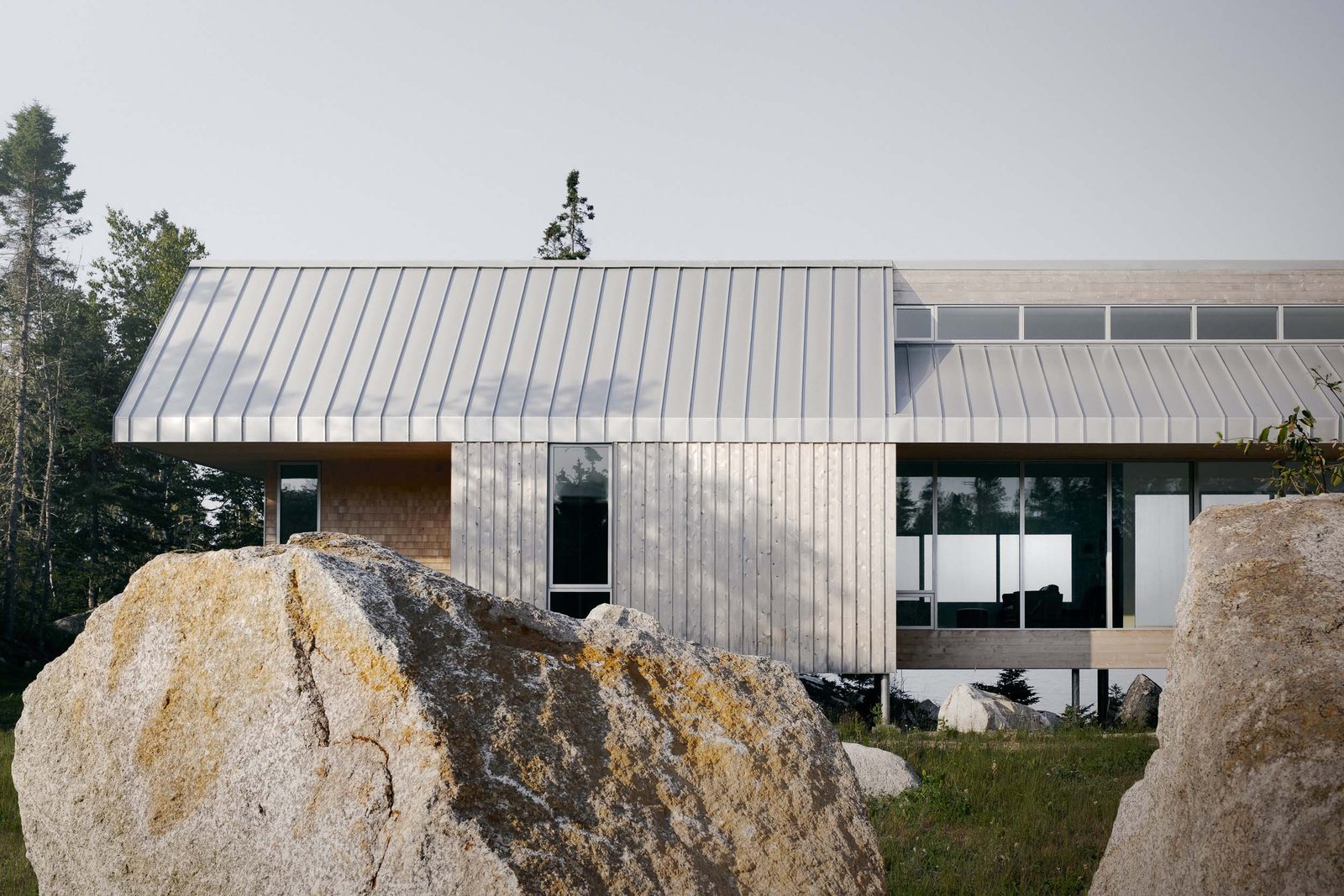 The home, a residence for a couple relocating from Montreal, arrives delicately on the land. A series of slender steel beams support the structure, minimizing the intervention on the nature beneath it. Above the beams, a cedar base makes up the low-slung home as it stretches across the embankments, topped with a long, offset metal-clad gable.