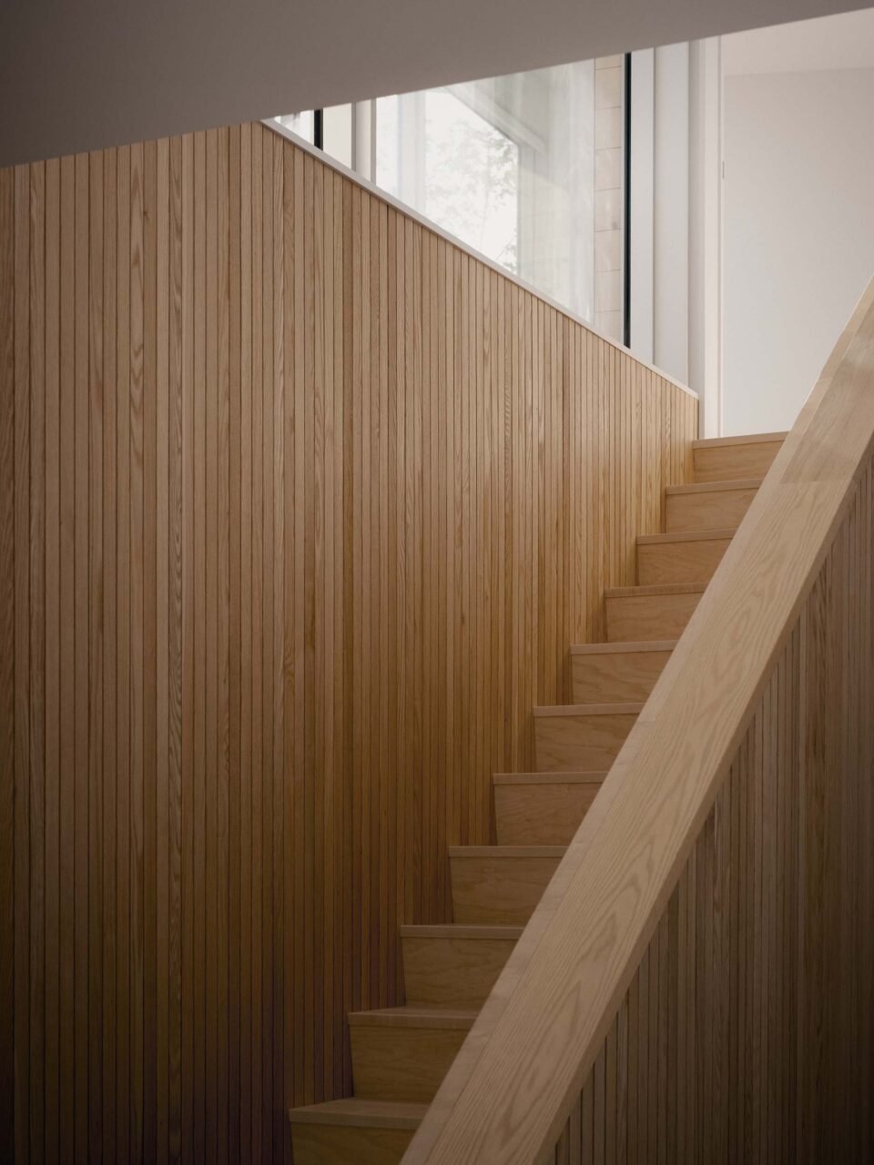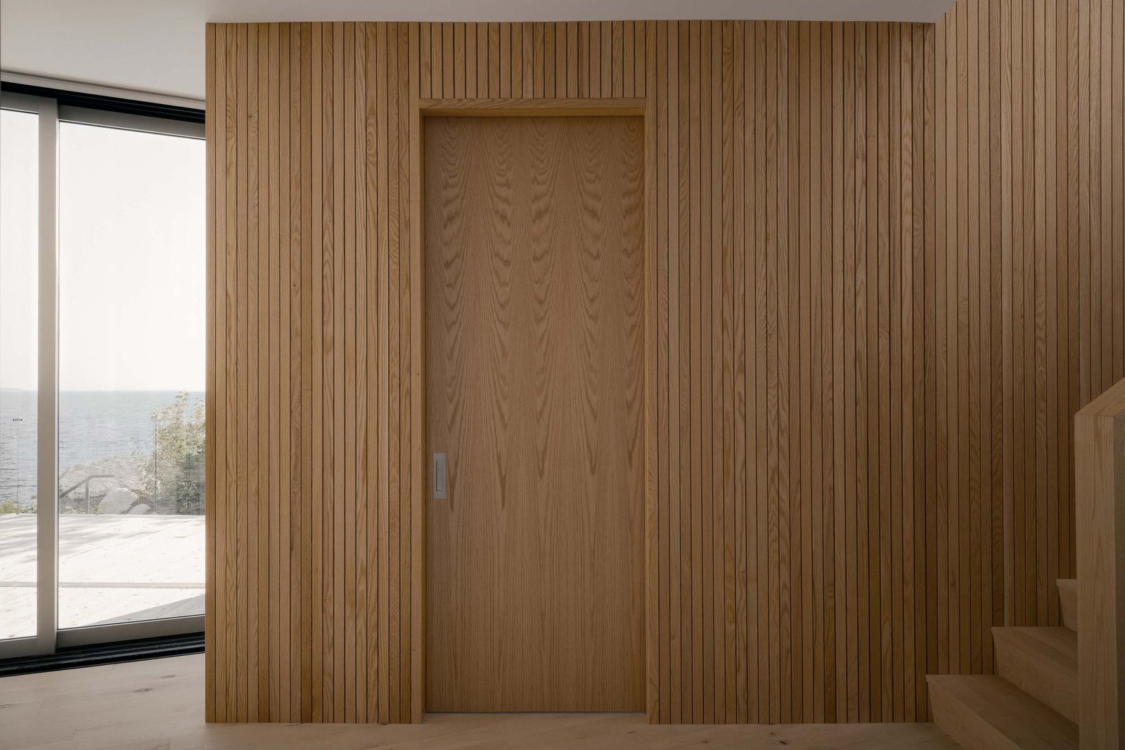 The interior reflects the material palette of the residence’s surroundings. Soft, weathered gray, wood floors, and more cedar walls bring the tones of the rocks and sand inside. Coupled with minimal furnishings and decor, the materials and the exterior views suffuse the home. Like the textured rocks at its base, quiet texture, brought along by fluted wood and exposed wood grain, provides a calming balm to the interior.
