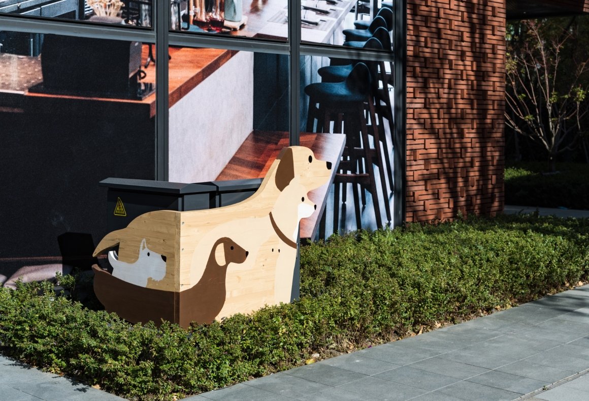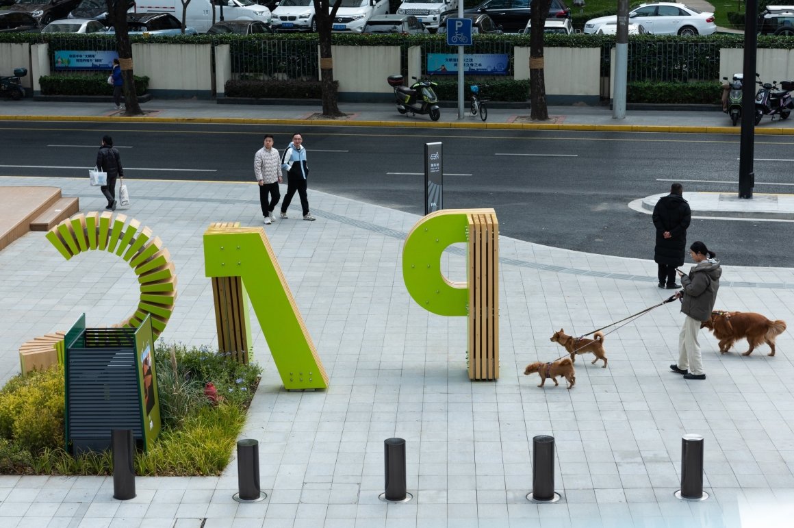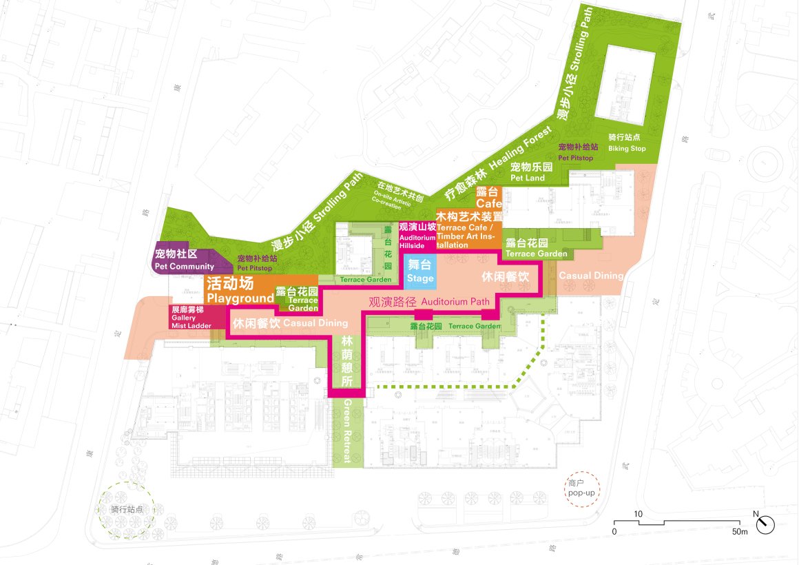上下联动的街区环路被打通,遵循“最轻度即兴改造(Adhocism)”的原则。亲生命(Biophilia)设计意向从拟态、绿意、木构三个维度、结合可持续理念贯穿设计、建造和运营。街区设施被尽量二次利用,如出地面电箱被改造为商户海报或遛狗导视。