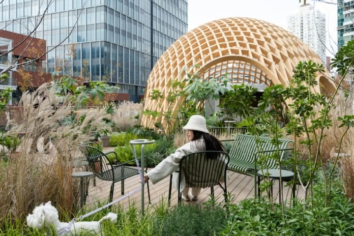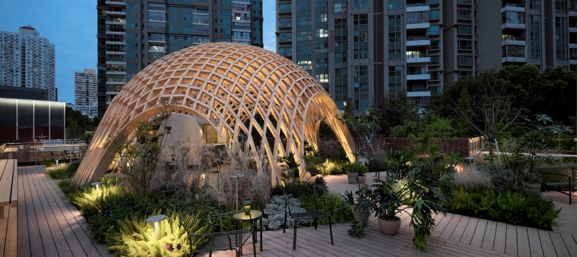 ▽蛋壳露台由原设备露台改造而来,最具辨识性的蛋壳木网穹顶与惬意的丛林咖啡 © 钱诗韵