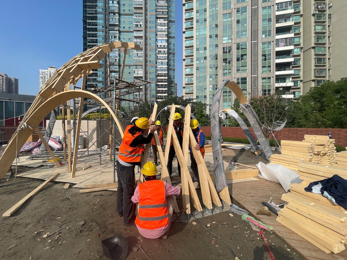 ▽蛋壳木网穹顶现场拼接组装 © 钱诗韵