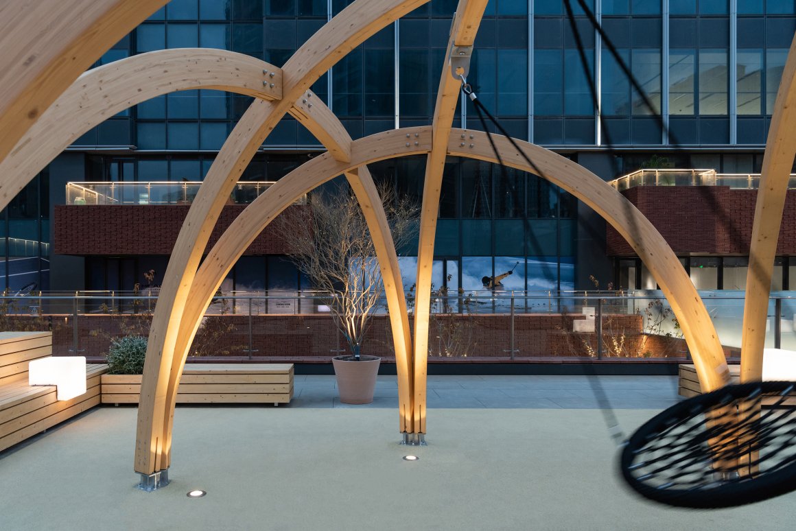 沿小径折几弯,遇见又一架木穹顶,脚下是软软的活动场,秋千挂中间,家长围坐外边,等着换上自己。雾梯似曾相识,拾级而下,可通往内街入口。