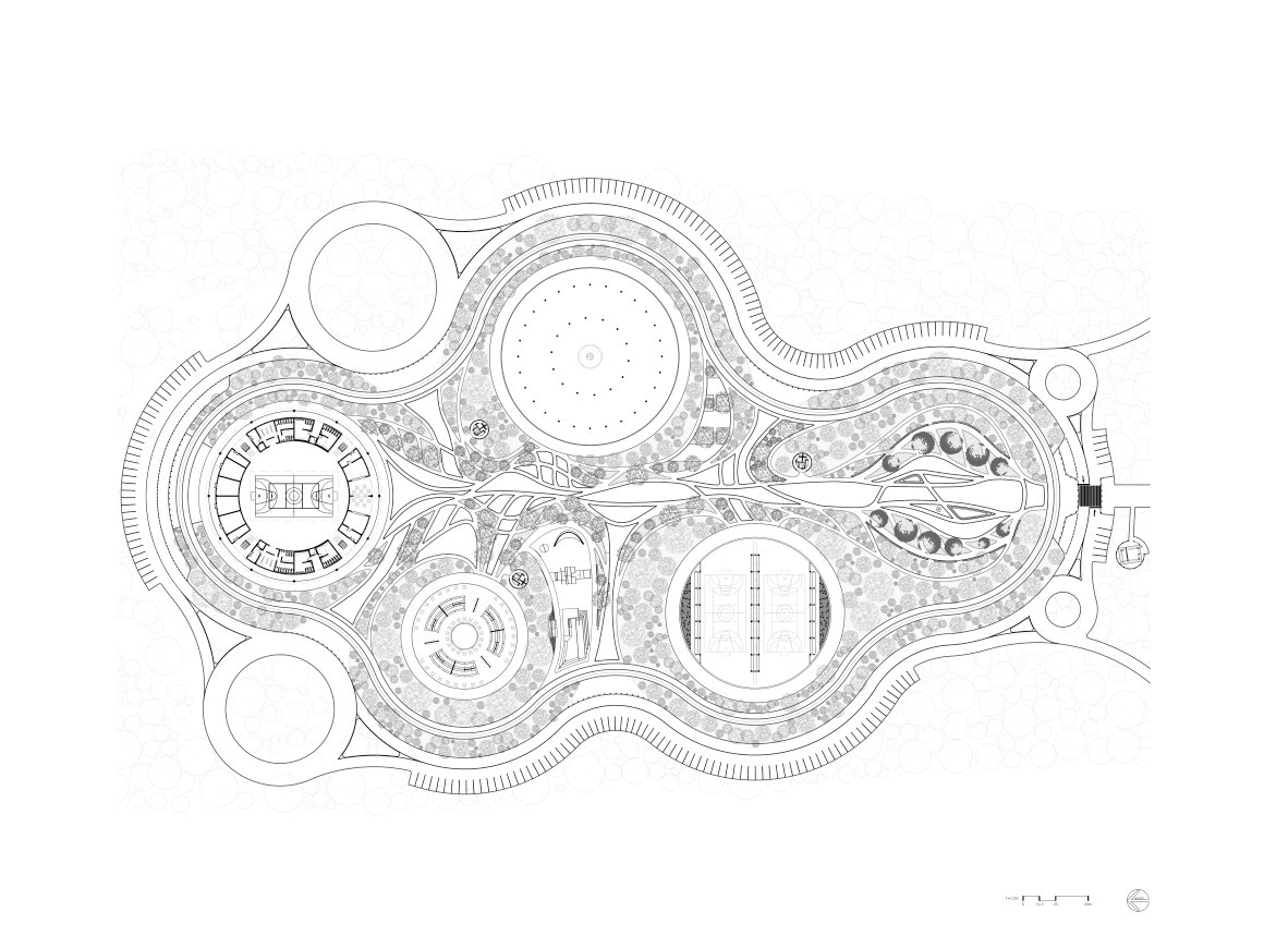 每个场馆都被赋予了特定的周长,根据其层级和功能需求确定其在布局中的位置。这些圆形场馆之间的连接通过相切的弧线建立,形成一个连续的环路,柔化了场地的生硬边界,并将各种类型的空间整合为一个连贯的整体规划方案。