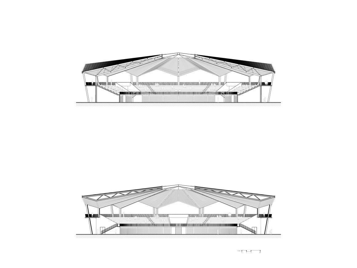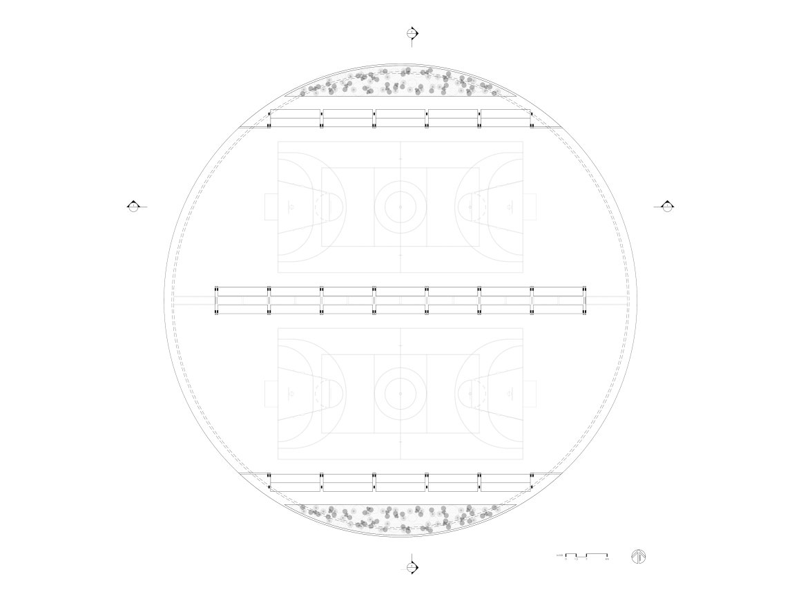 ▽ 篮球场内部空间结合结构柱,设置看台空间