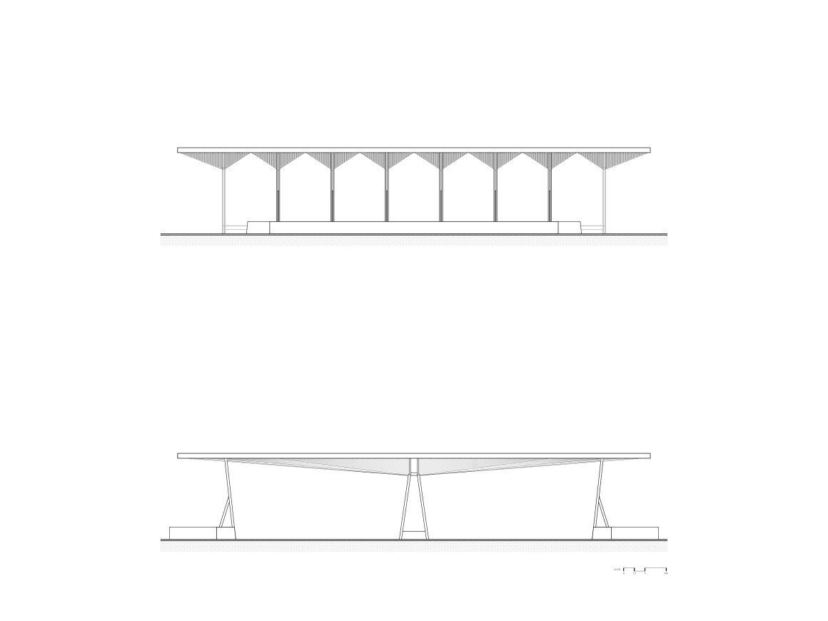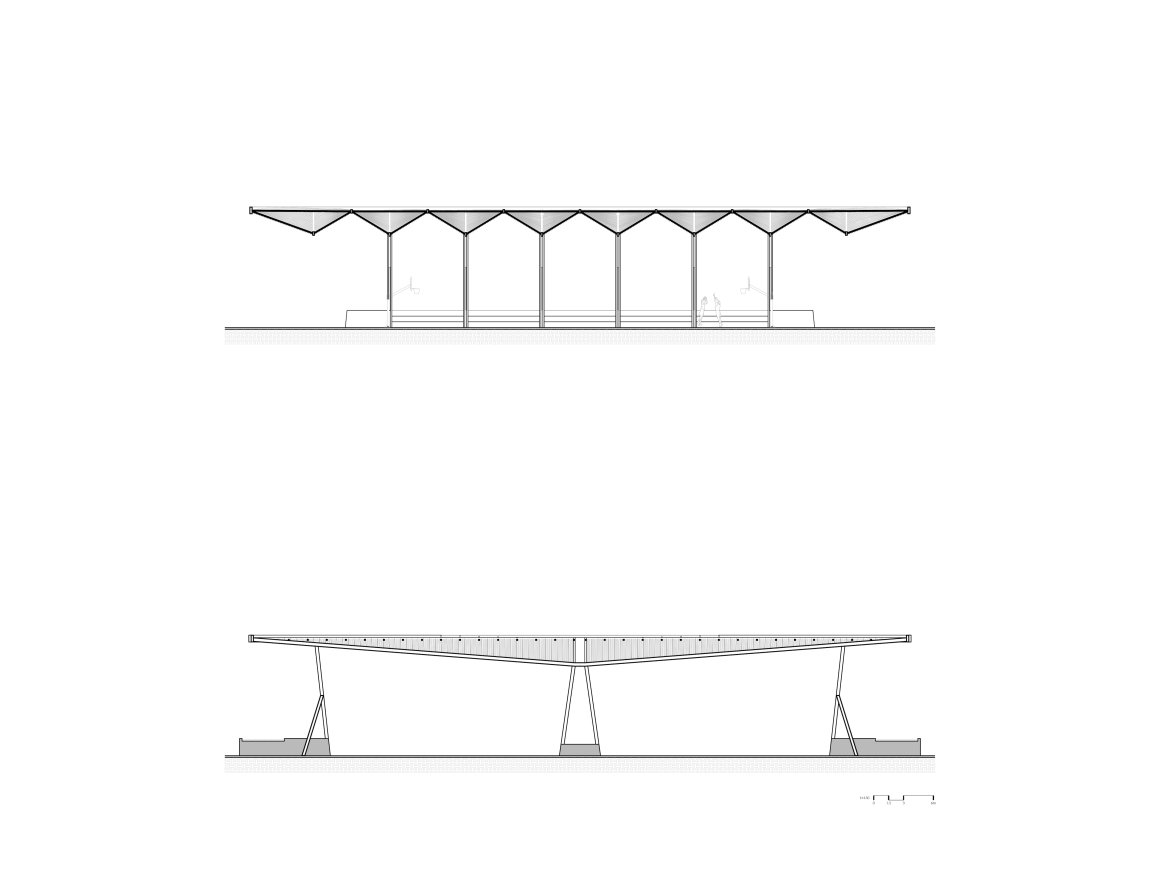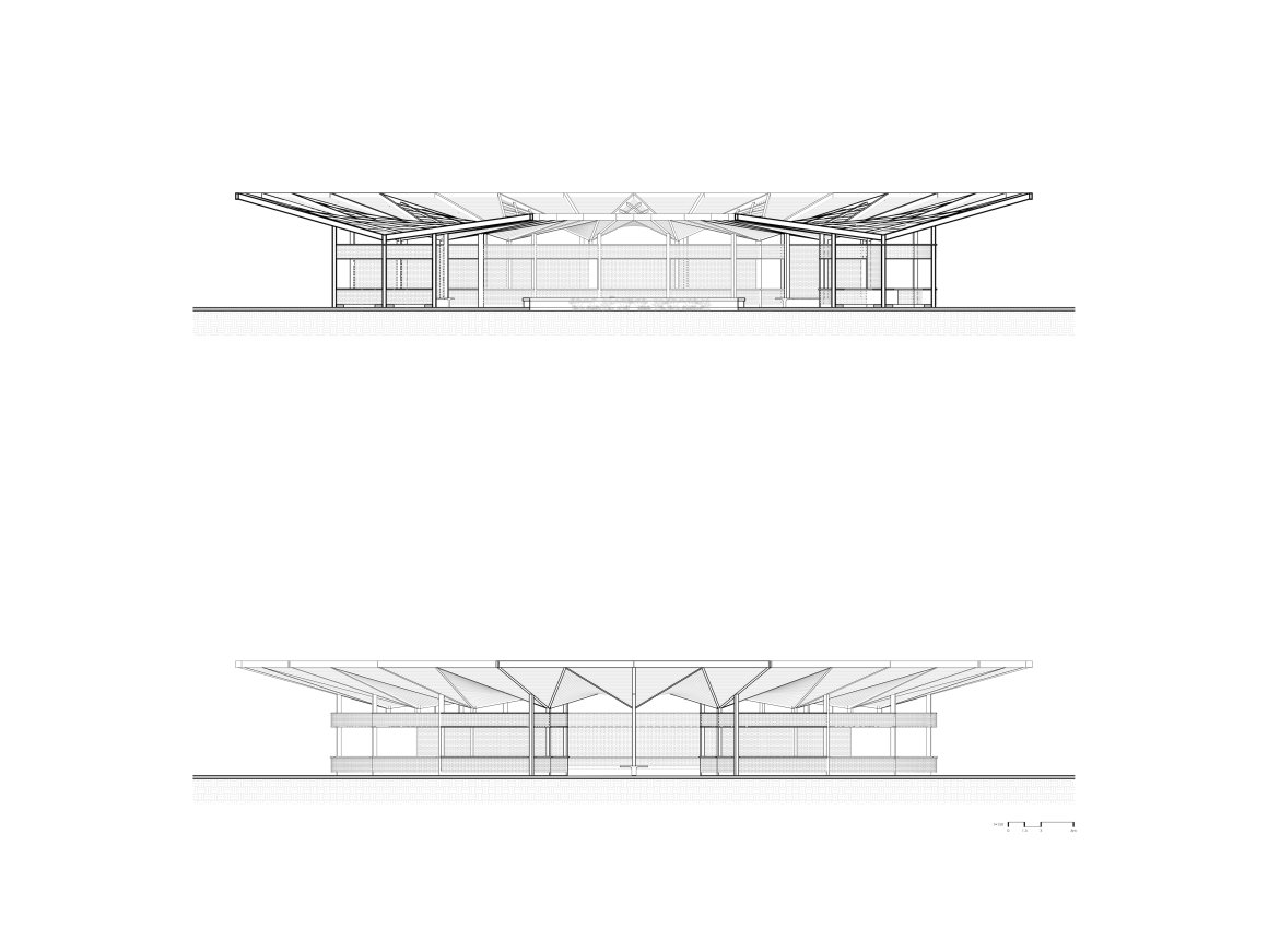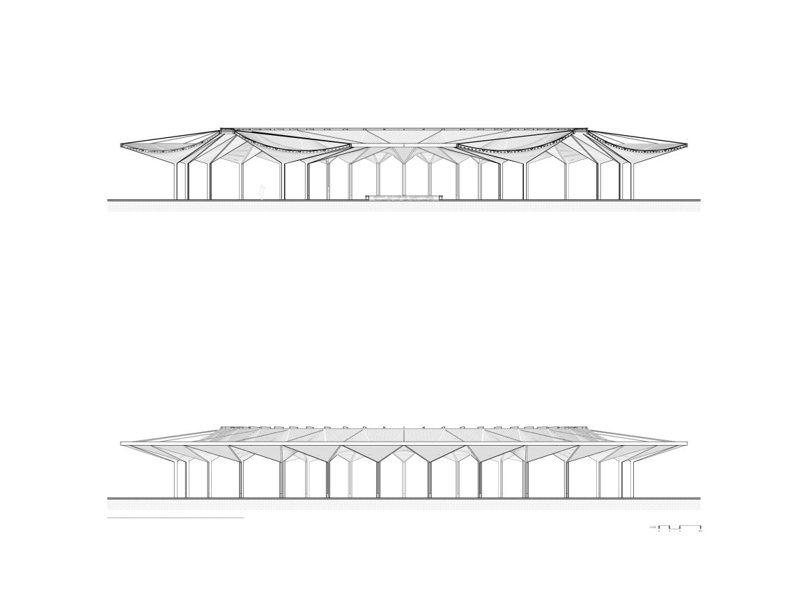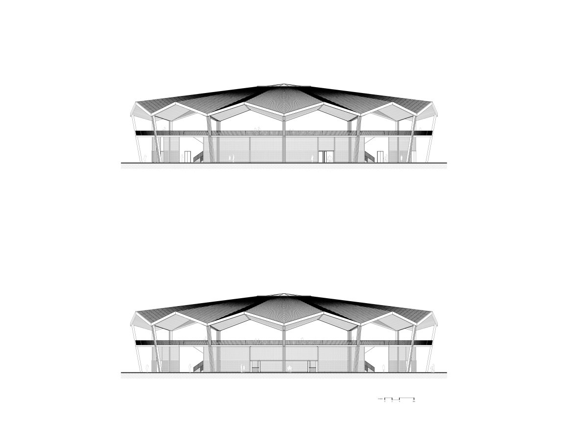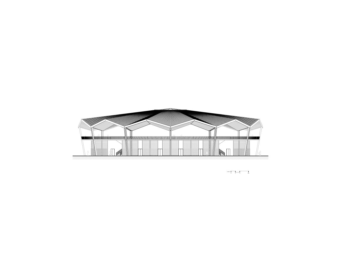 这些建筑采用轻质金属框架,为整体项目增添了一抹俏皮的色彩,带来独特的流畅感。细长的橄榄绿柱子和起伏的木质装饰与周围的森林完美融合,而瓦片屋顶则能抵御暴雨。呈辐射状的建筑的墙壁采用了砖纹图案,以增强质感,并设有开口以促进空气流通和自然通风。此外,所有建筑在设计时都考虑到了模块化,以确保成本效益并简化施工流程。