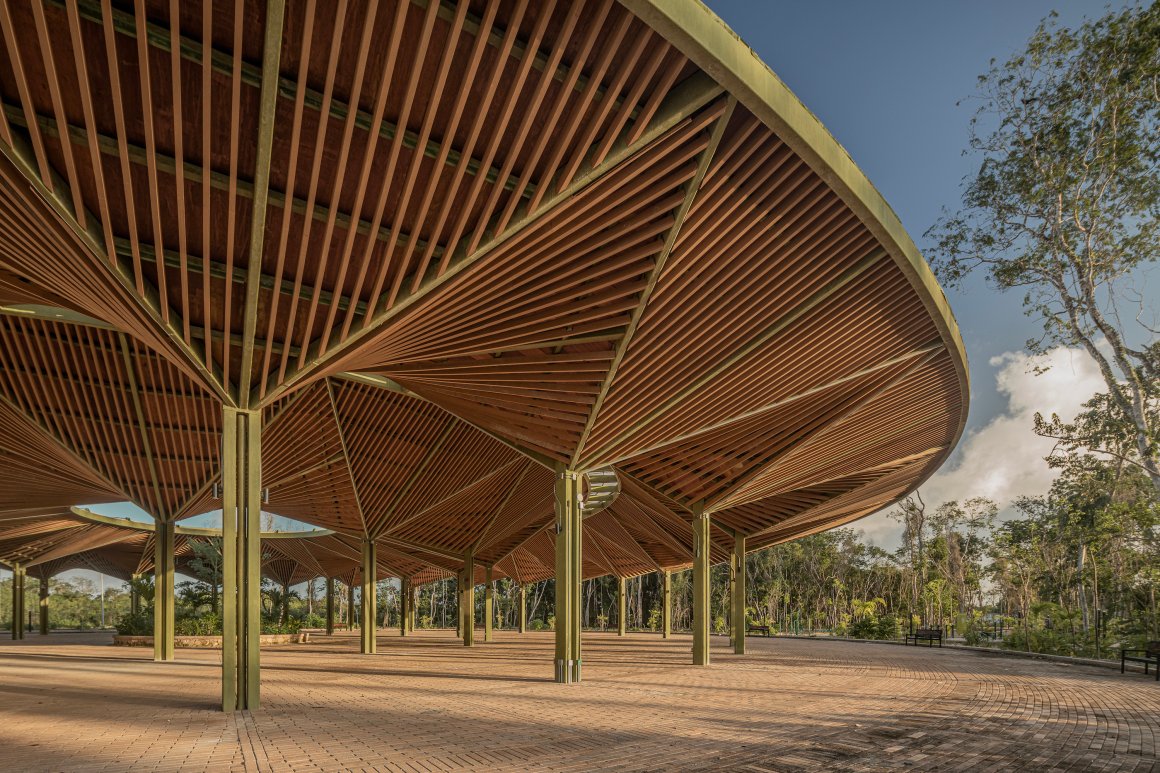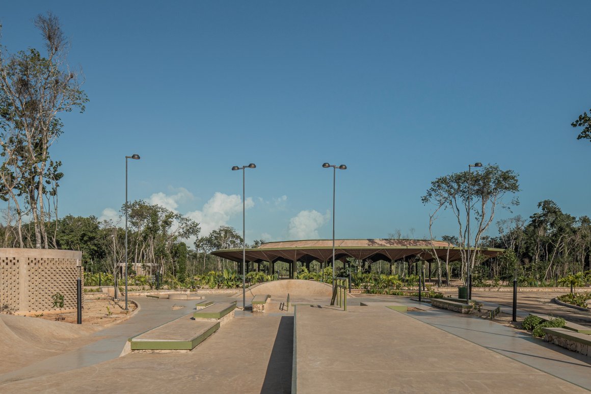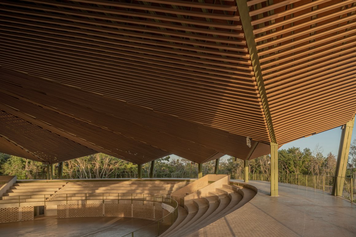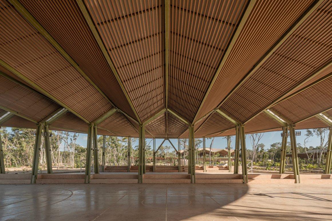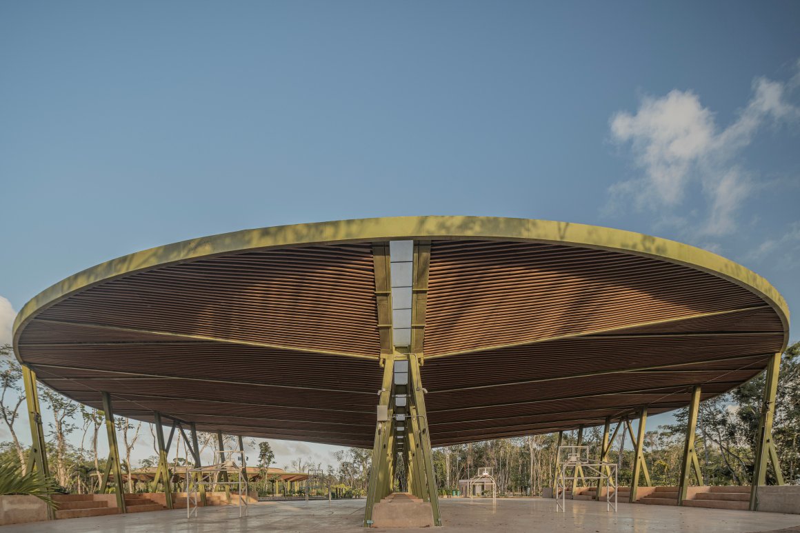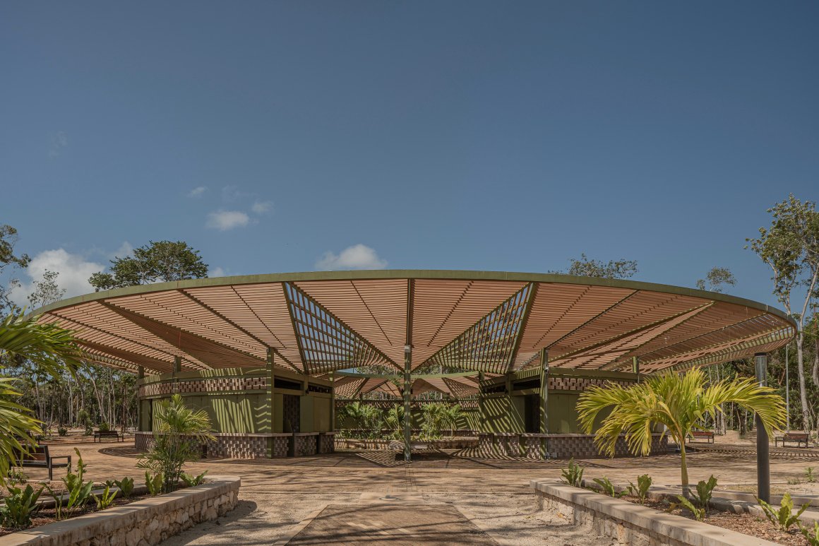 At the entrance of the site, a civic square is bordered by eleven ceiba trees, which are ancestral trees indigenous to Mexico, greeting visitors. Each tree symbolizes one of the eleven municipalities that constitute the state of Quintana Roo. From this point, the park transitions into a series of streams that guide visitors through various venues, creating a fluid non-hierarchical experience that culminates at the arena, the largest structure on the premises.