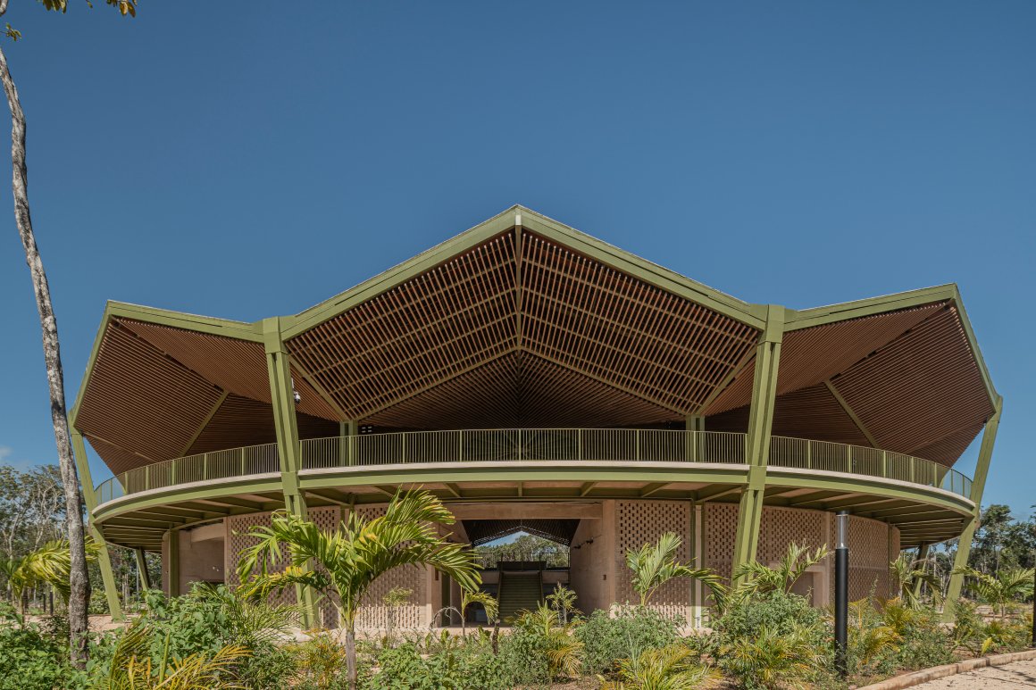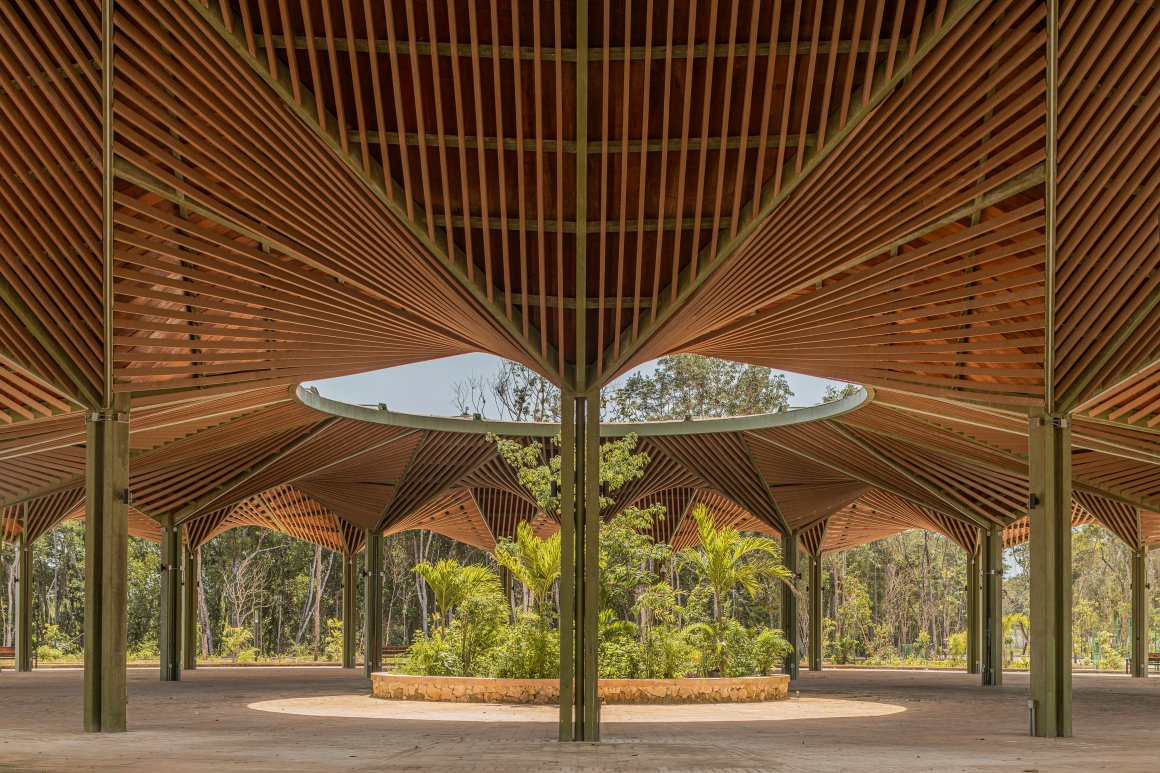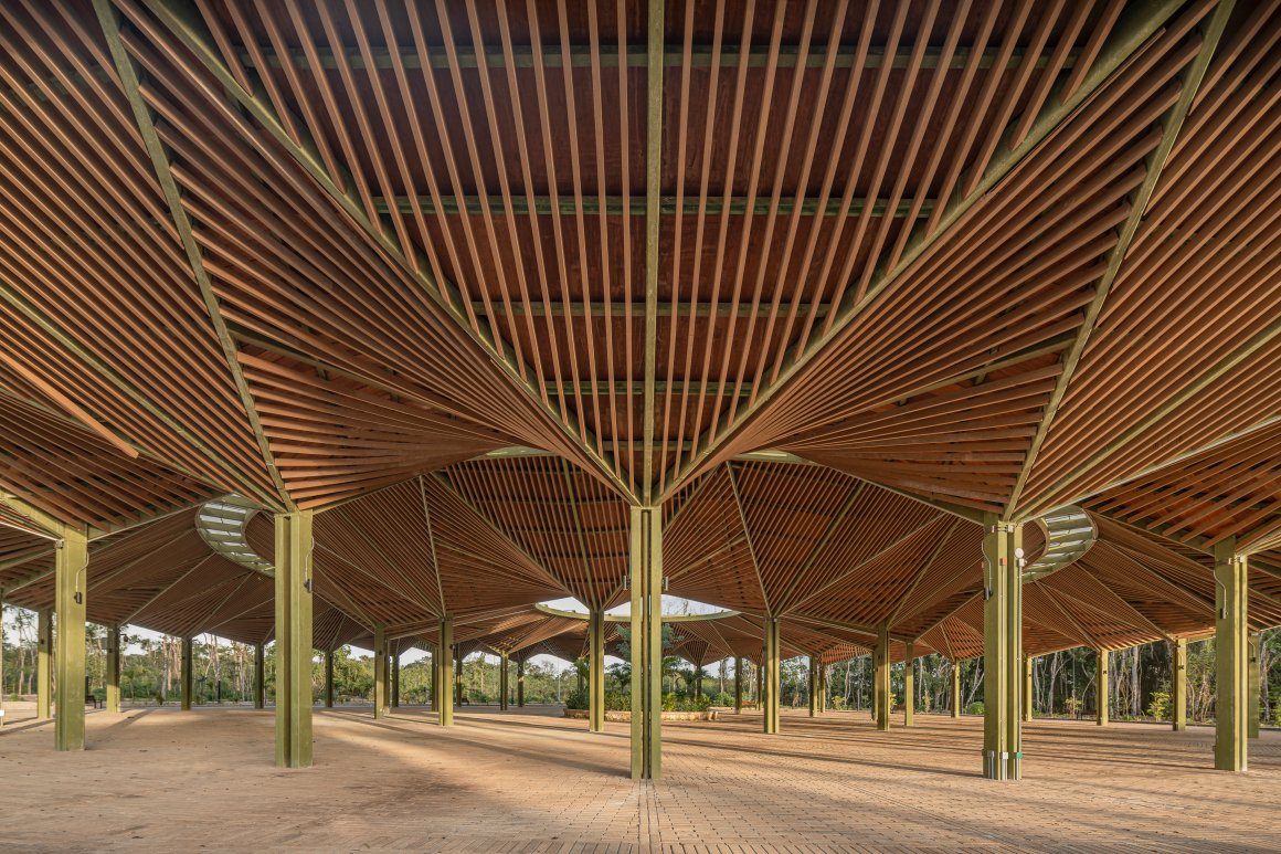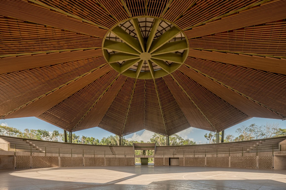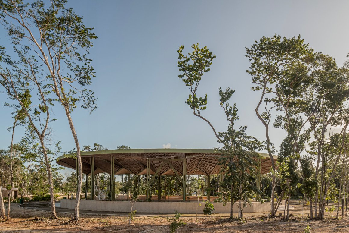 At the entrance of the site, a civic square is bordered by eleven ceiba trees, which are ancestral trees indigenous to Mexico, greeting visitors. Each tree symbolizes one of the eleven municipalities that constitute the state of Quintana Roo. From this point, the park transitions into a series of streams that guide visitors through various venues, creating a fluid non-hierarchical experience that culminates at the arena, the largest structure on the premises.