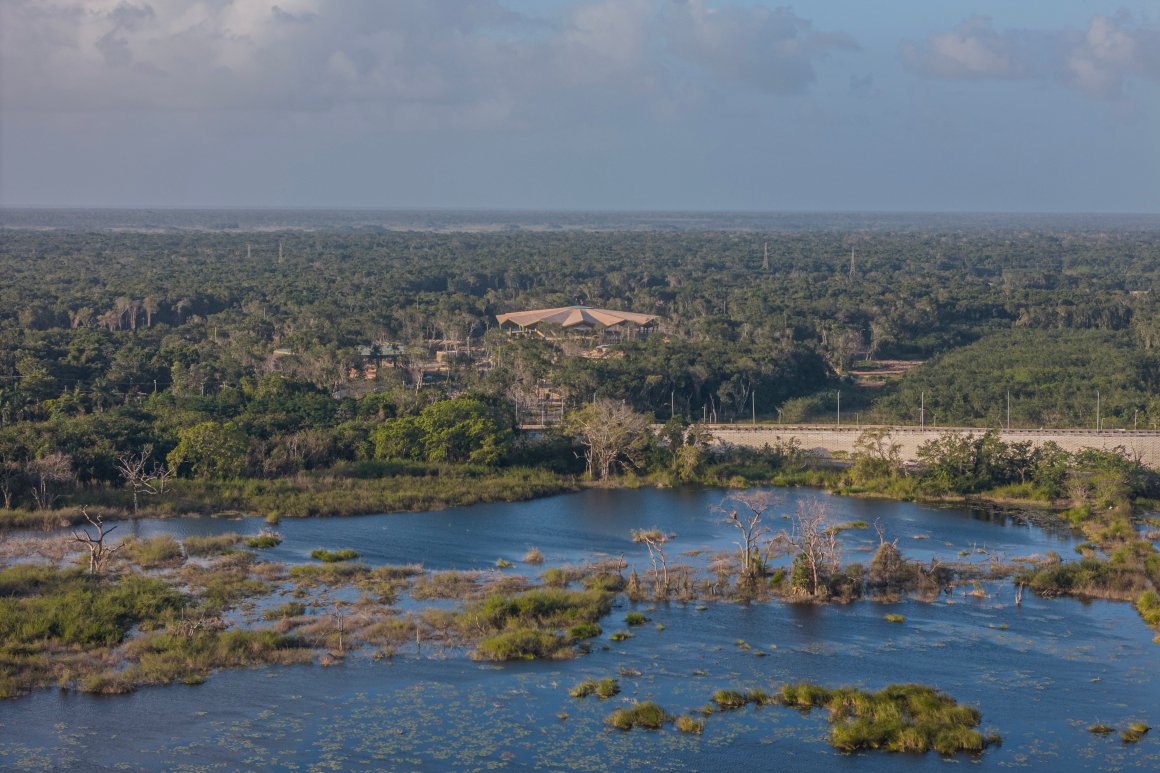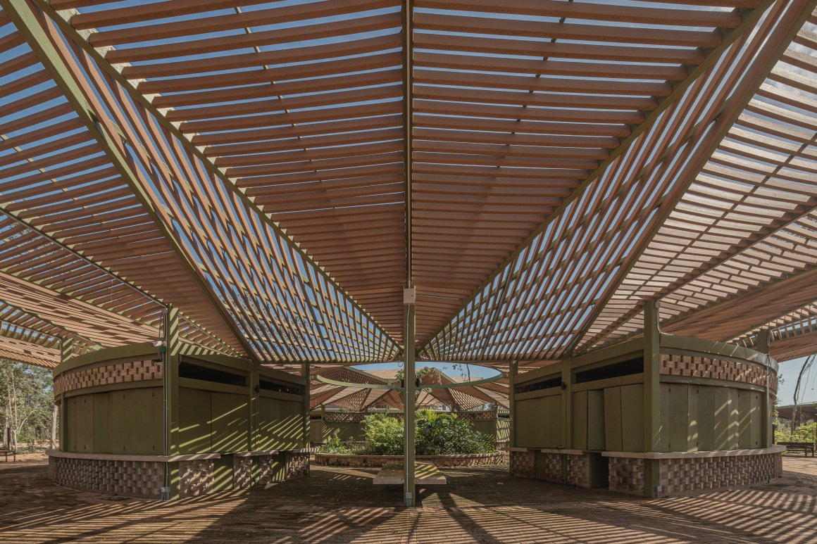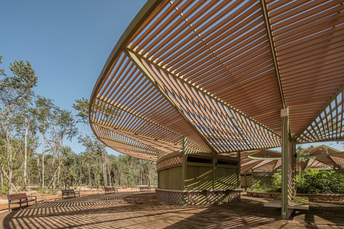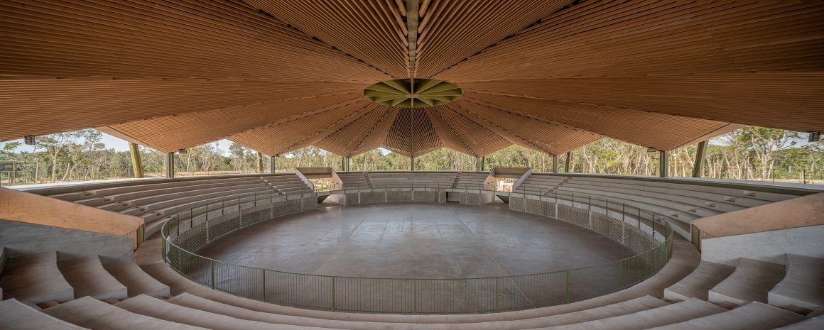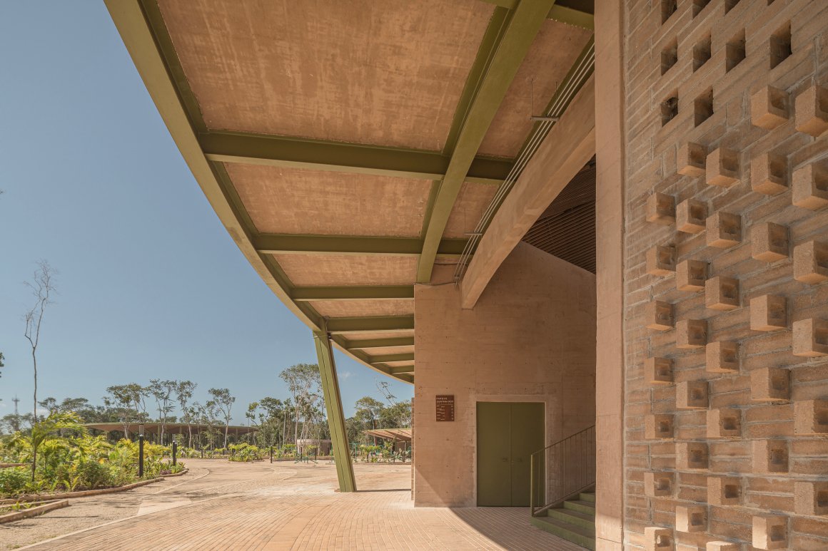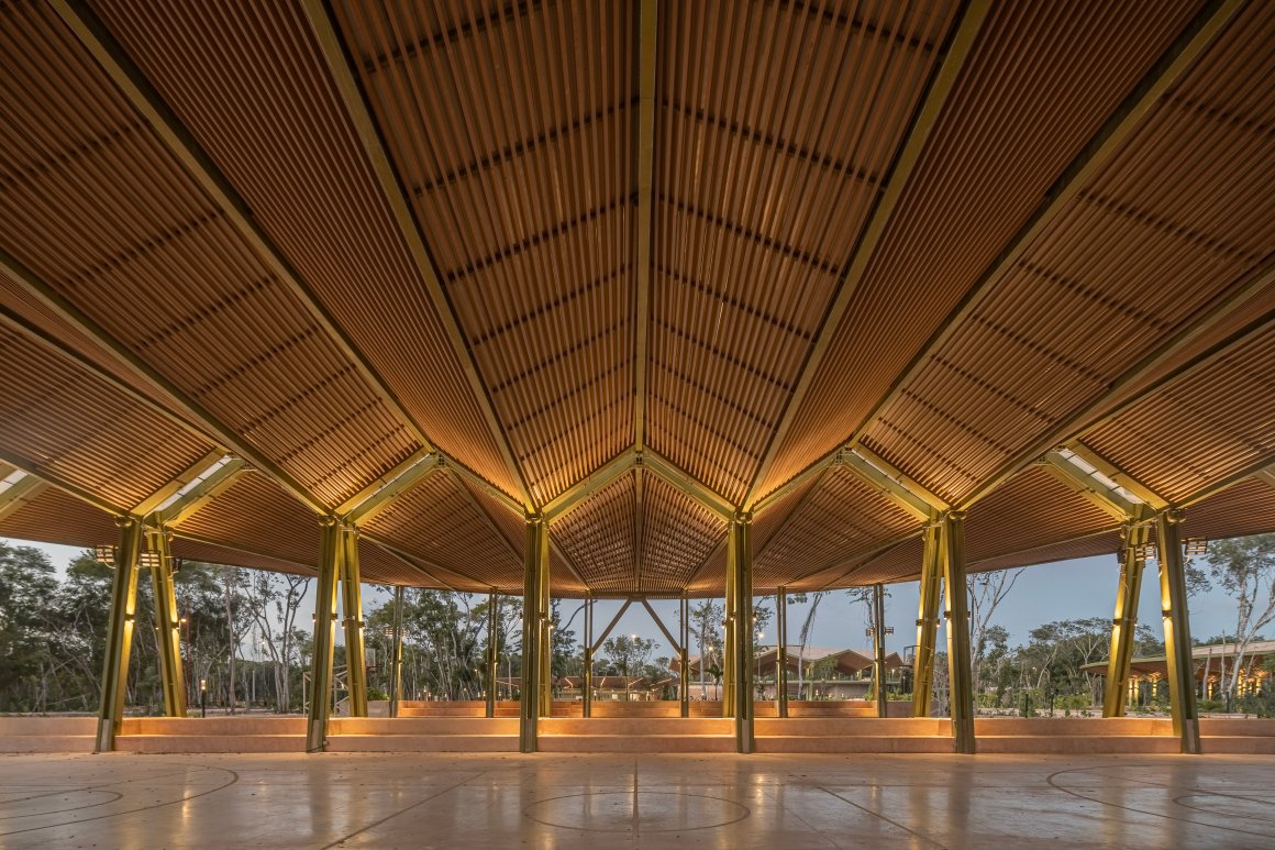 At the entrance of the site, a civic square is bordered by eleven ceiba trees, which are ancestral trees indigenous to Mexico, greeting visitors. Each tree symbolizes one of the eleven municipalities that constitute the state of Quintana Roo. From this point, the park transitions into a series of streams that guide visitors through various venues, creating a fluid non-hierarchical experience that culminates at the arena, the largest structure on the premises.