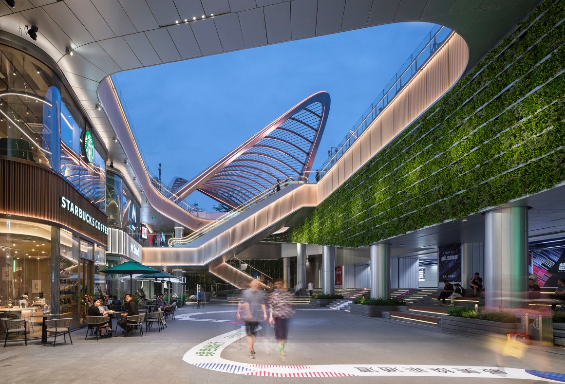 绿墙、艺术雕塑与建筑形成空中多维一体的悬浮感景观。为复合空间增添自然体验同时,塑造了视线强引导,联动地面与地下