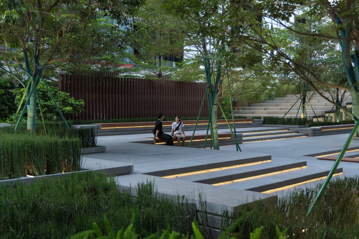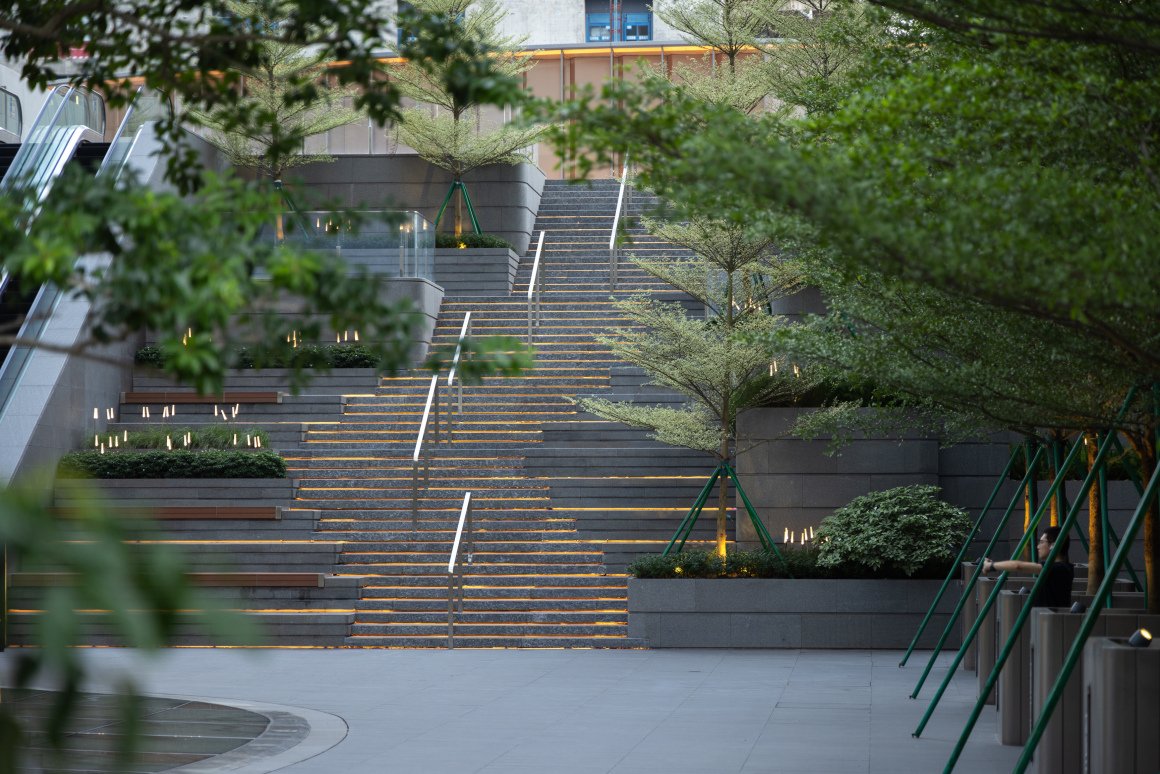 By incorporating natural elements such as ground cover trees and arranging walking paths.Transforming the monotony of multi-level steps into the joy of traversing through the mountains and forests.The setting of leisure benches and resting platforms provides a natural space for office workers to relax and chat.