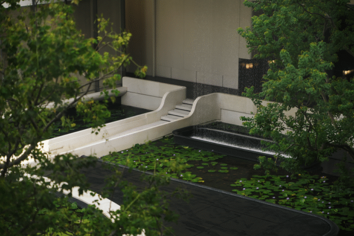 A 6-meter-high water curtain cascades gracefully into the space, its evenly flowing sheets mimicking the natural echo of mountain streams. The sunken pathway continues the resort’s relaxed ambiance, laid with meticulously arranged beige stones. Hidden beneath the water’s surface are carved patterns that interact playfully with the gentle flow of water, creating a captivating illusion of reality and reflection.