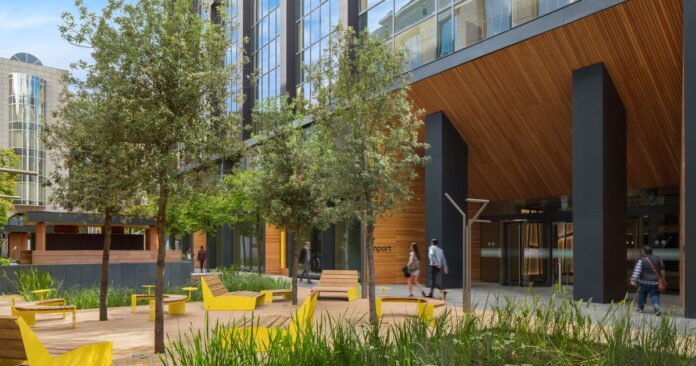 • Republic is a new campus at East India Docks: the design is centred around well-being at work with a focus on daylight and ventilation, direct connections with nature through the planting in the biodiverse central gardens