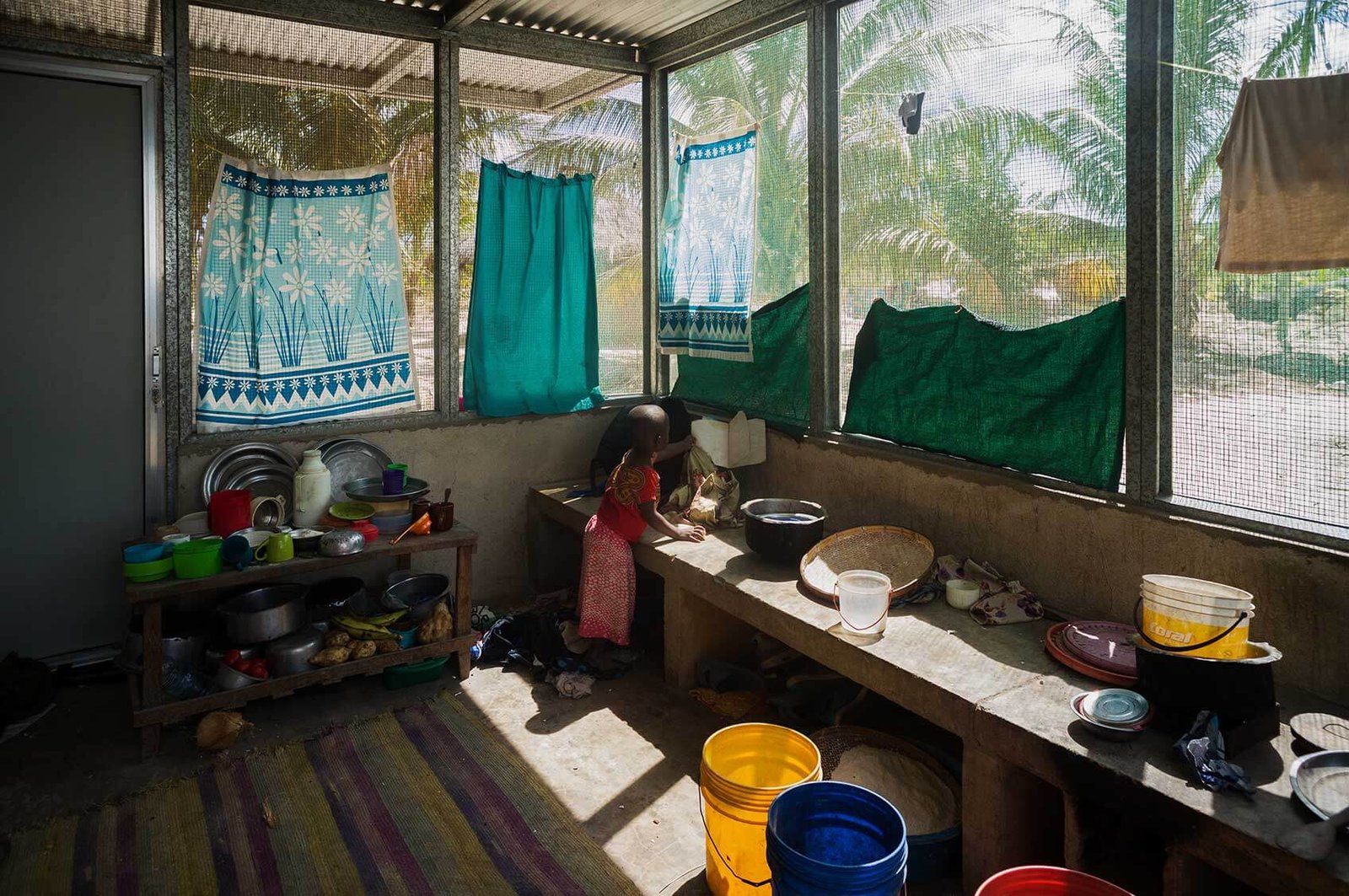 The windows are screened, and self-closing doors likewise reduce insect entry. The homes have rainwater harvesting systems for safe drinking water, fly-proof ventilated pit latrines, solar power lighting, and cooking stoves that vent smoke outdoors.