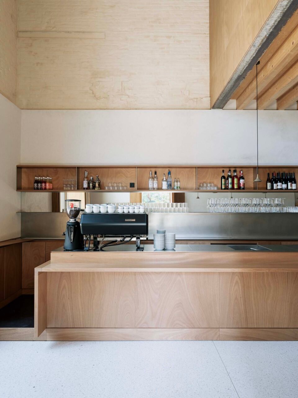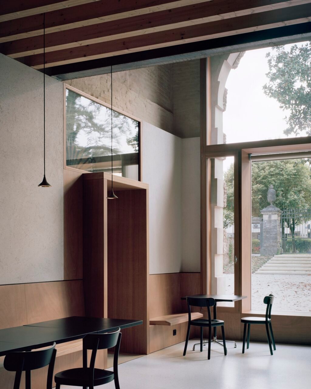 Adjacent to the hall, a new cafe continues the raw-meets-wood language. The double-height space maintains the texture of the original masonry, revealing where a former hayloft used to be in the space. The main window frame of laminated and plywood okoumè wood continues in the interior, defining the new custom furnishings: the counter, benches, and a service block.