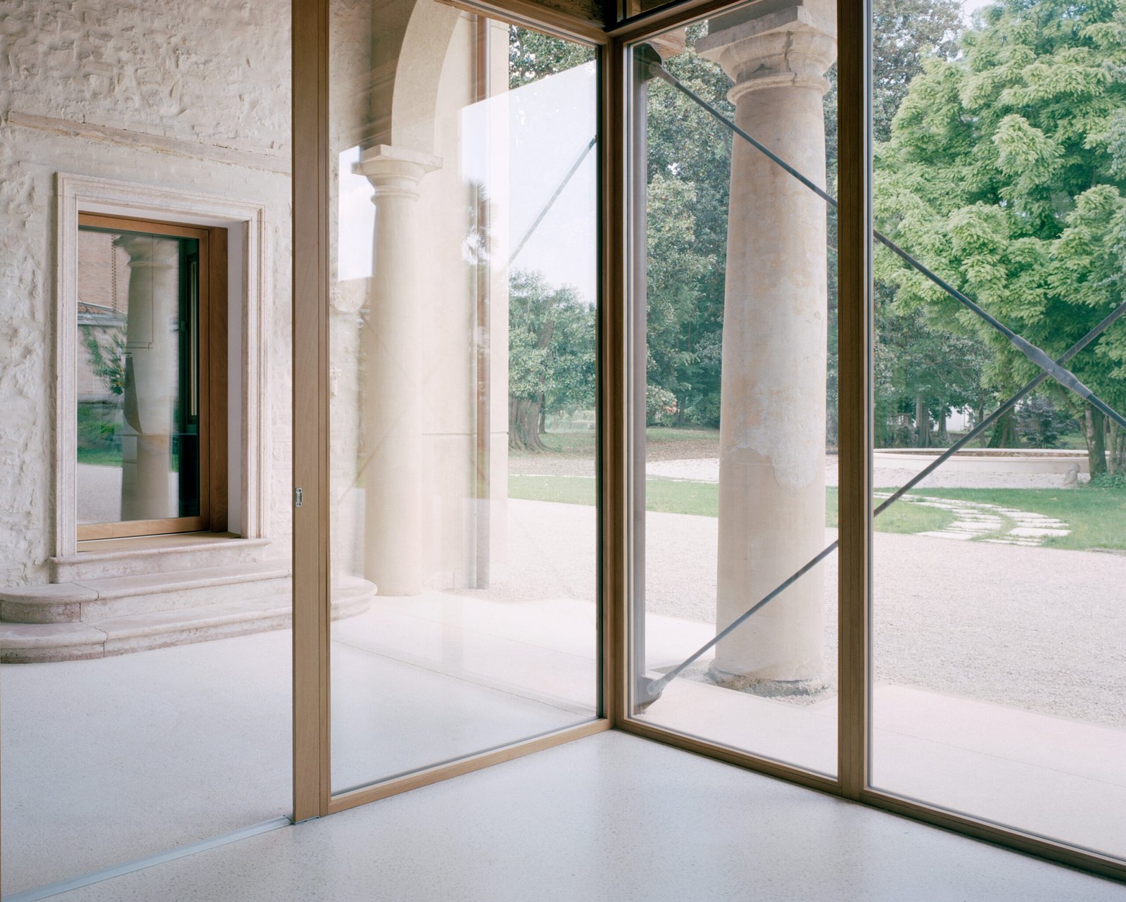 Right around the corner, the barchessa unfolds with a new portico, made of a timber frame. It rests snugly within the stone colonnade, supported by slender iron beams which support the upper floor. While running parallel to the original stone columns of the barchessa, the new beams stand apart from the historic site but crucially support its weight.