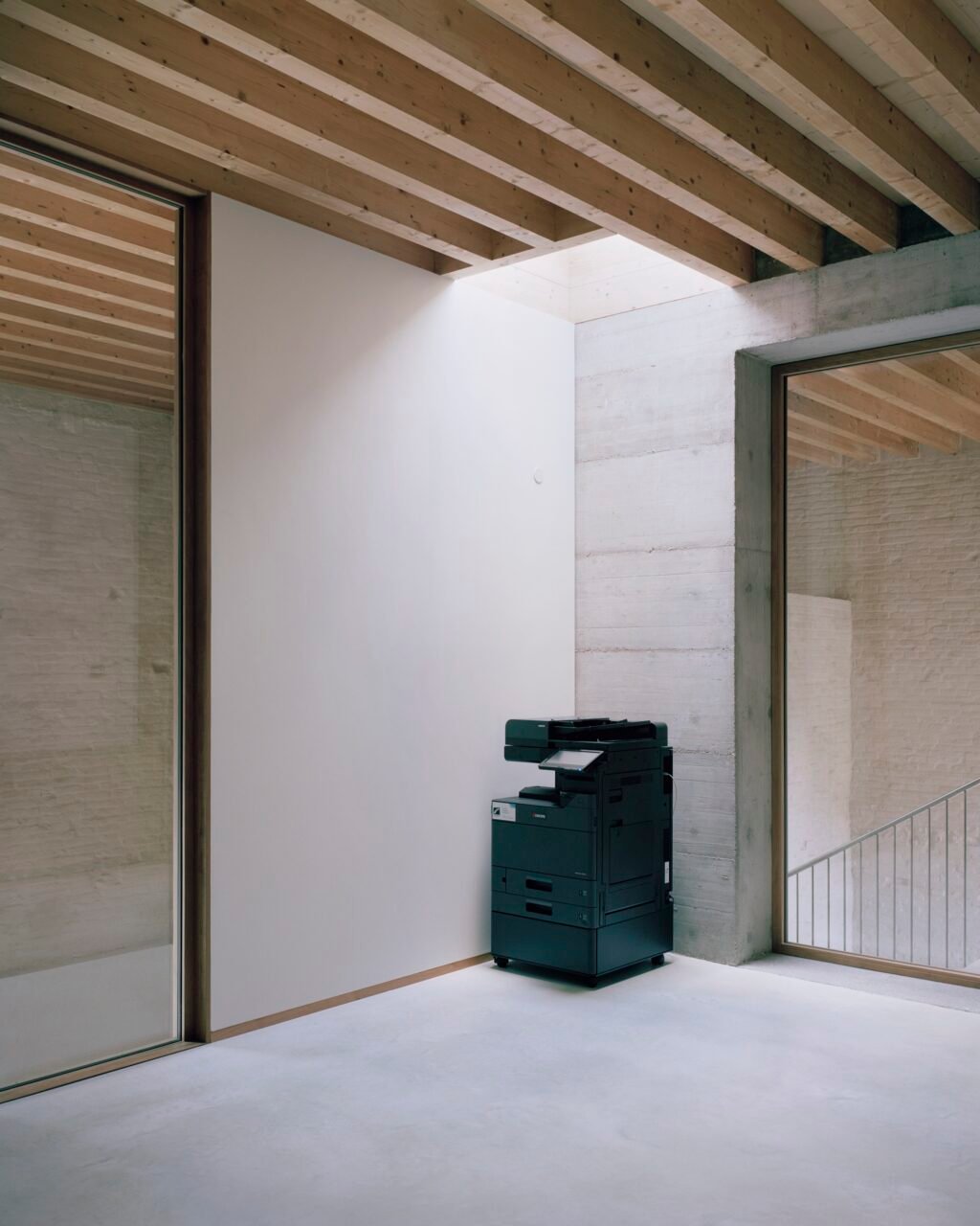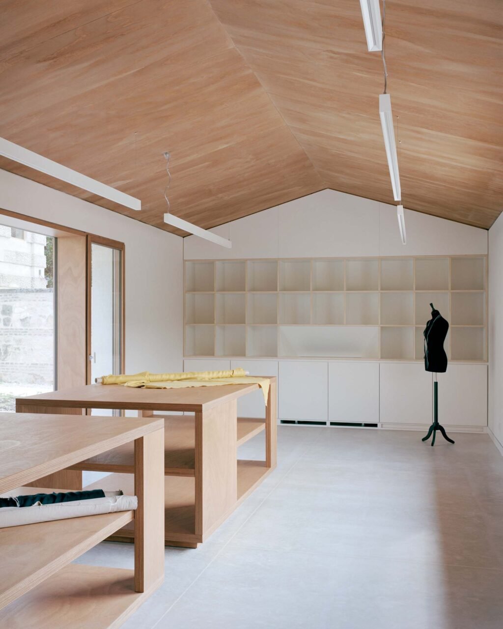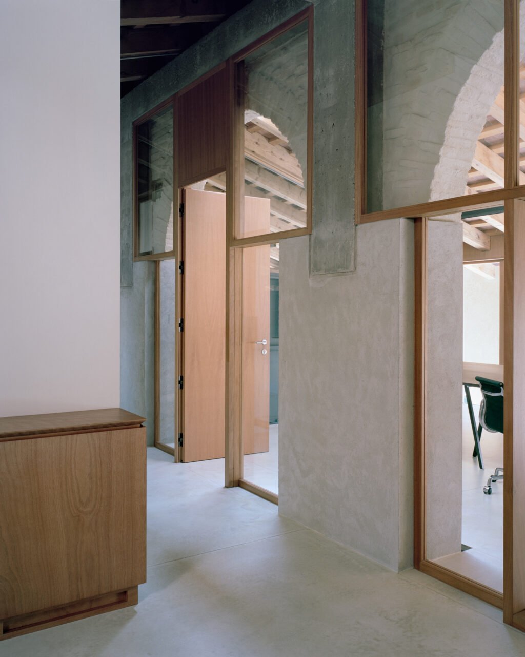 The offices continue in the new annex, a low-slung building with a sloped roof, to be in dialogue with yet still stand apart from the barchessa. Here, polished concrete floors and oiled wood surfaces create a luminous interior. Daylight filters in through glazing framed in wood, which responds to the language of the portico.