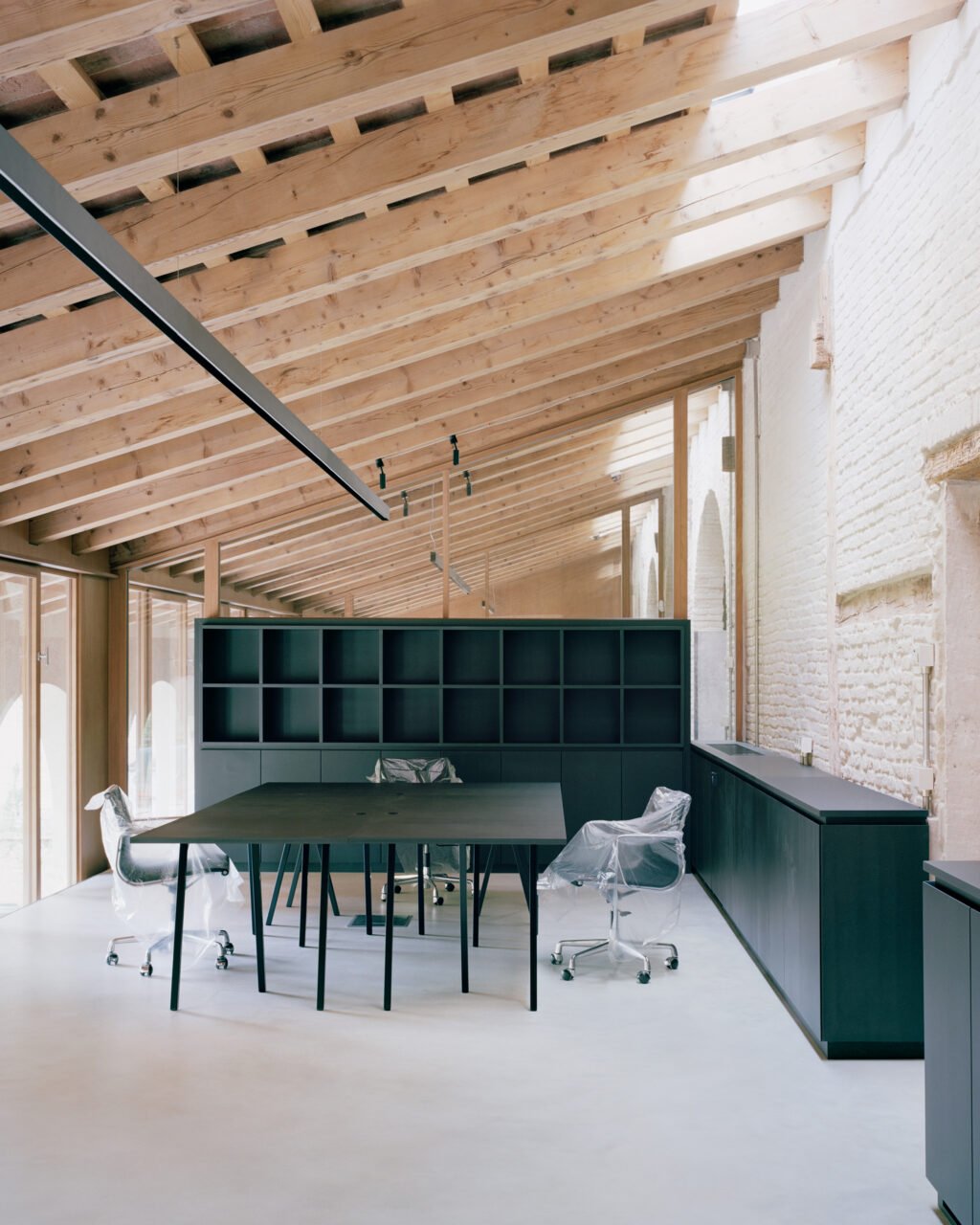 A new staircase made of concrete cast in MDF formwork with Vicenza gray stone treads leads upstairs to office and coworking spaces. One one side, a new glazed volume hosts communal work areas and meeting rooms. The space melds new black cabinets juxtaposed with the sloped wooden rafters and light from the top of the barchessa’s arches. On the other side, private offices are housed within traditional masonry and timber, separated by a corridor of wooden frames mounted on a reinforced-concrete structure. This move both resolves structural issues while intervening in the space in a way that maintains the legibility of the building’s history.