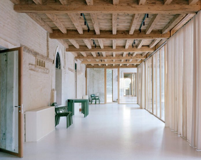 The barchessa, defined by its traditional row of arches, extends 3,000 square feet (926 square meters) from the main building. The facade bears the marks of multiple transformations over the centuries, from 18th-century modifications to 19th-century alterations. Of the three archways that line the barchessa’s exterior, the central arch stands apart, as a protruding wooden box suspends out over a glass opening. The interruption marks the new intervention in the site and hints at the new additions within.