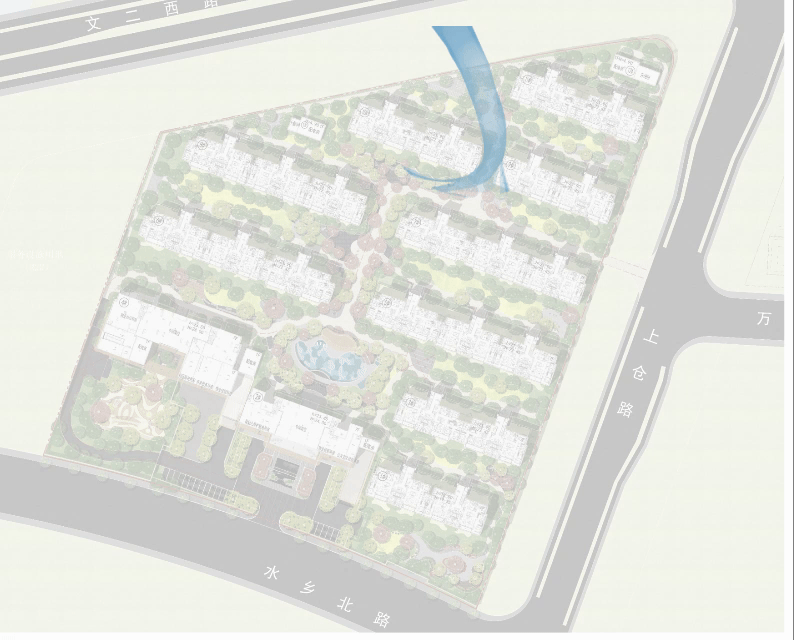 借西溪湿地水岸渗透,引入自然蜿蜒的河流,以水的张力,撑开景观主轴空间,徐徐展开一幅山水长卷。