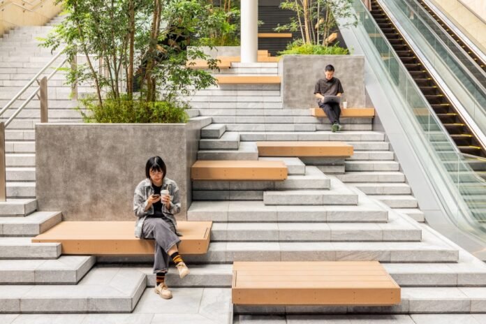 二楼的设计考虑到了与从田町站延伸而来的步行平台的连续性,可以俯瞰新干线等铁路轨道。而位于28楼的仅供办公使用的露台则采用简单的长椅和植物盆栽排列,营造出可供个人或团体使用的互动空间。也就是这些三维交错空间、多层次的绿化区域和聚会场所,以及由此引发的邂逅和新发现将成为田町的新特色。