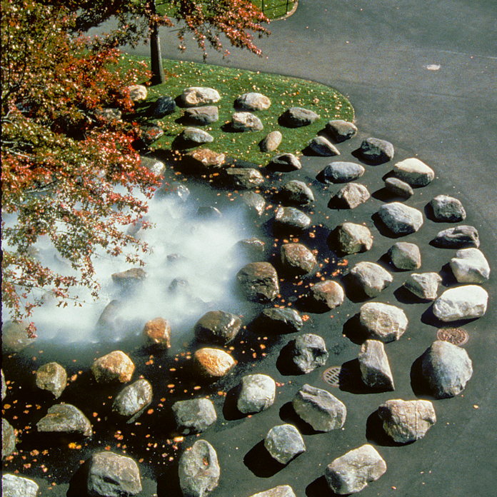 Located at a pedestrian crossroads near Harvard Yard, this prize-winning fountain, consisting of 159 granite boulders sourced from regional farms, recalls the colonists’ arduous experience of clearing their agricultural fields. Set smooth side up, the boulders create a 60-foot-diameter circle overlapping the asphalt paving, the existing grass, and two trees. Water emitted from 32 nozzles located in the center of the circle is captured and re-circulated through the fountain. For three seasons of the year the nozzles emit a dematerializing mist while in winter steam from the university heating plant creates a fog around the fountain. The fountain elegantly displays the snow that Cambridge unfailingly provides and invites human participation without suggesting any particular activity. As a result, the fountain is heavily used by people of various ages who sit, read, climb, jump, flirt, converse, and meditate.