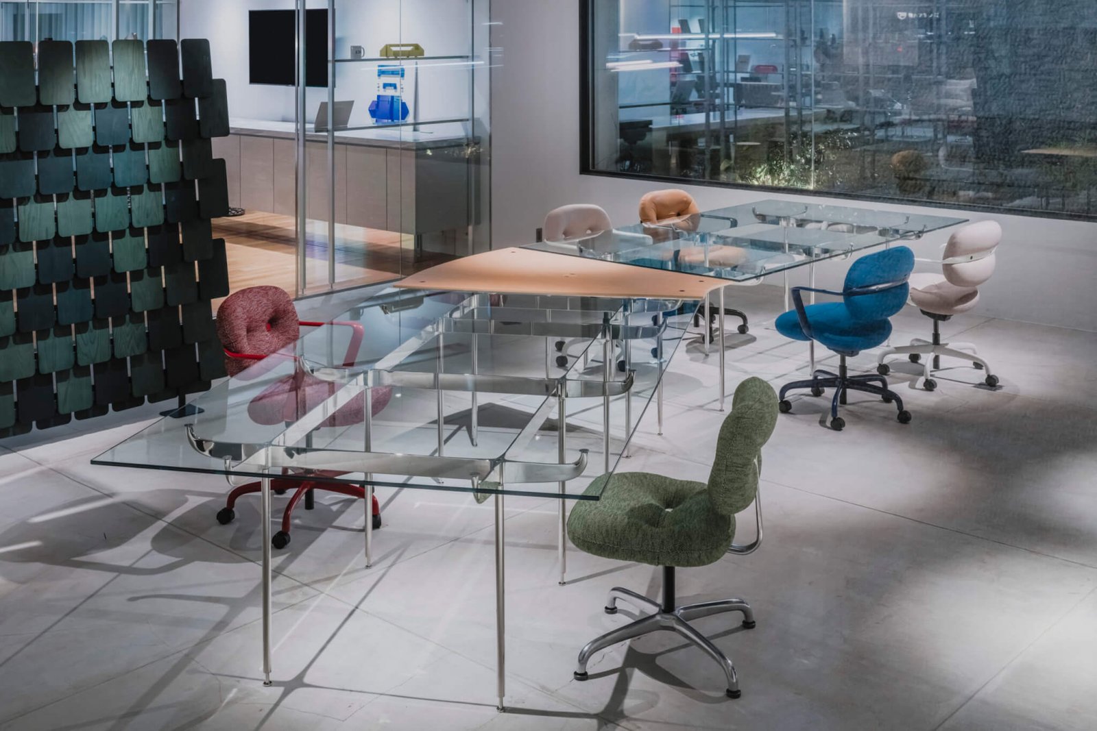 New Japanese office furniture brand NII, part of the long-standing ITOKI Corporation, presented a host of new work at Salone del Mobile. Included is a collaboration with New York–based designer and architect Rodolfo Agrella. CONNEXA’s glass top exposes its sleek, steel infrastructure below. The system allows different configurations and extensions.
