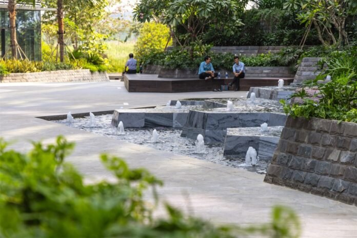 The residential podium’s highlight is a 360-degree full-length infinity edge swimming pool, granting a continuous view of the surroundings. It includes an Olympic-length lap pool, a spa pool with Jacuzzi jet pods, shallow lounge areas, and a family pool with subtle water play elements. The design, inspired by the rejuvenating properties of water, evokes the dynamics of dry, cracked soil revived by monsoon rains.