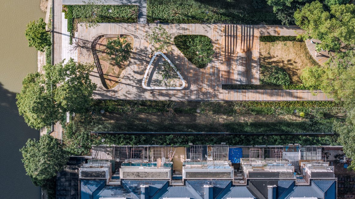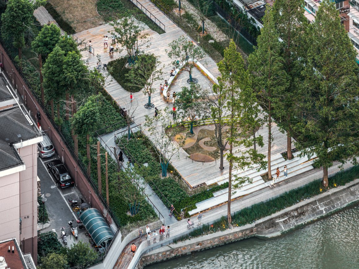 于是,我们在设计中将邻近浪水浜的甲板局部抬高1.5米,并结合现场保留大树形成一个容纳不同形式交往活动的“起翘的甲板”。在这里,由由社区居民可以站在与河对岸高端住宅小区居民几乎相同的城市空间标高上赏景休憩,形成使用者感受上的“蓝绿融合”。也可以沿浪水浜向东看向不远处的浦东图书馆等近年新建地标建筑景观,向北远眺6公里外的世界级城市景观“陆家嘴三件套”,令由由社区居民可以在家门口近距离与上海的城市发展同频共振。