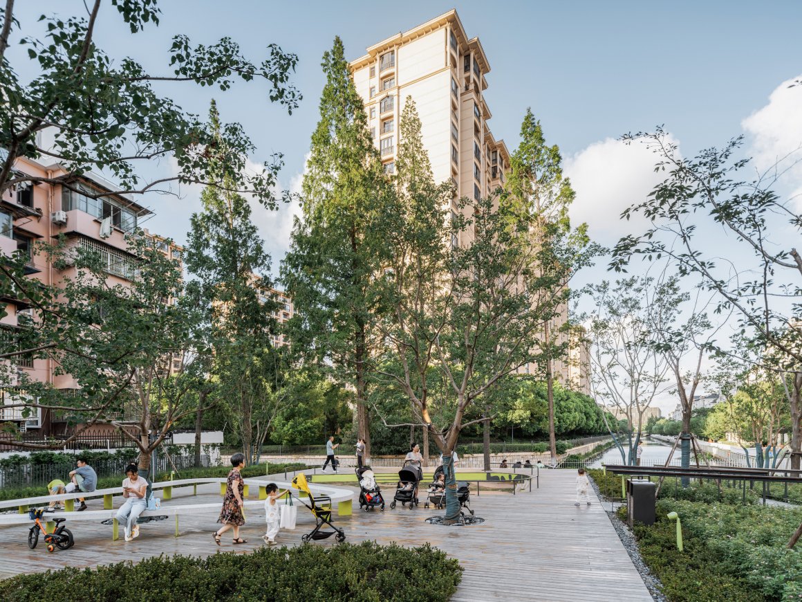 ▽我们在设计中将邻近浪水浜的甲板局部抬高1.5米,并结合现场保留大树形成一个容纳不同形式交往活动的“起翘的甲板” @CreatAR Images