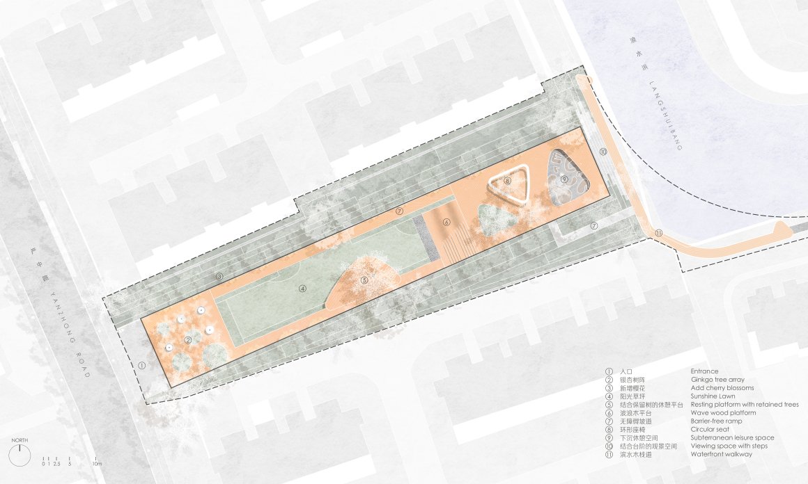 - The transition from the highest deck level to the riverside landscape is designed as stepped seating oriented towards views of Langshuibang, promoting spontaneous leisure activities.