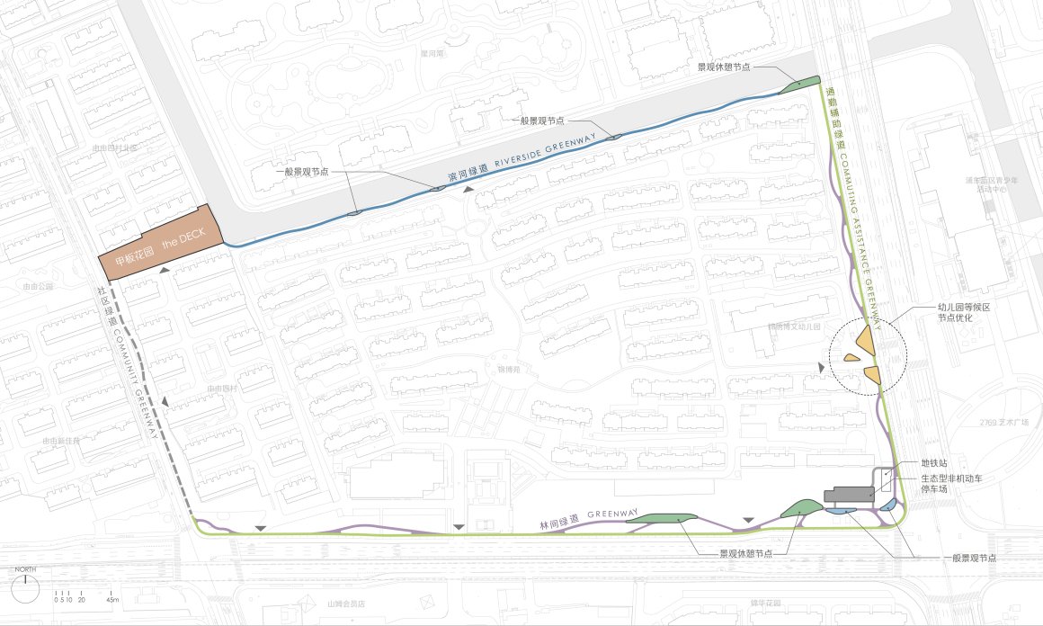 就规模、功能与景观特征而言,甲板花园是一处面向社区服务的“口袋公园”。而甲板花园的设计方案中关于中心城区高密度老旧社区的绿色公共生活方式与面对社区外部城市公共景观“风景平权”追求的表达,却让甲板花园这个口袋公园成为更大范围内为由由社区居民提升社区环境友好度的契机和引爆点。在2021年9月甲板花园方案通过各方审议后,为更好的完善与提升社区居民到相邻交通设施4、文化设施5的可达性与便利性,设计团队与业主团队共同策划了由由社区南片区“15分钟漫步圈”:一个以甲板花园为起点、总长约1800米的无障碍漫步环。并以“15分钟漫步圈”为线索建构沿线公共景观空间系统,完成滨水步行断点打通、现状非机动车停车空间梳理优化、游赏型步道与通勤步道的分型与融合、沿线幼儿园入口区域等候环境提升、城市防护绿地林下空间优化、小尺度景观游憩场所与设施植入等一系列小而美又具有系统性的设计工作。