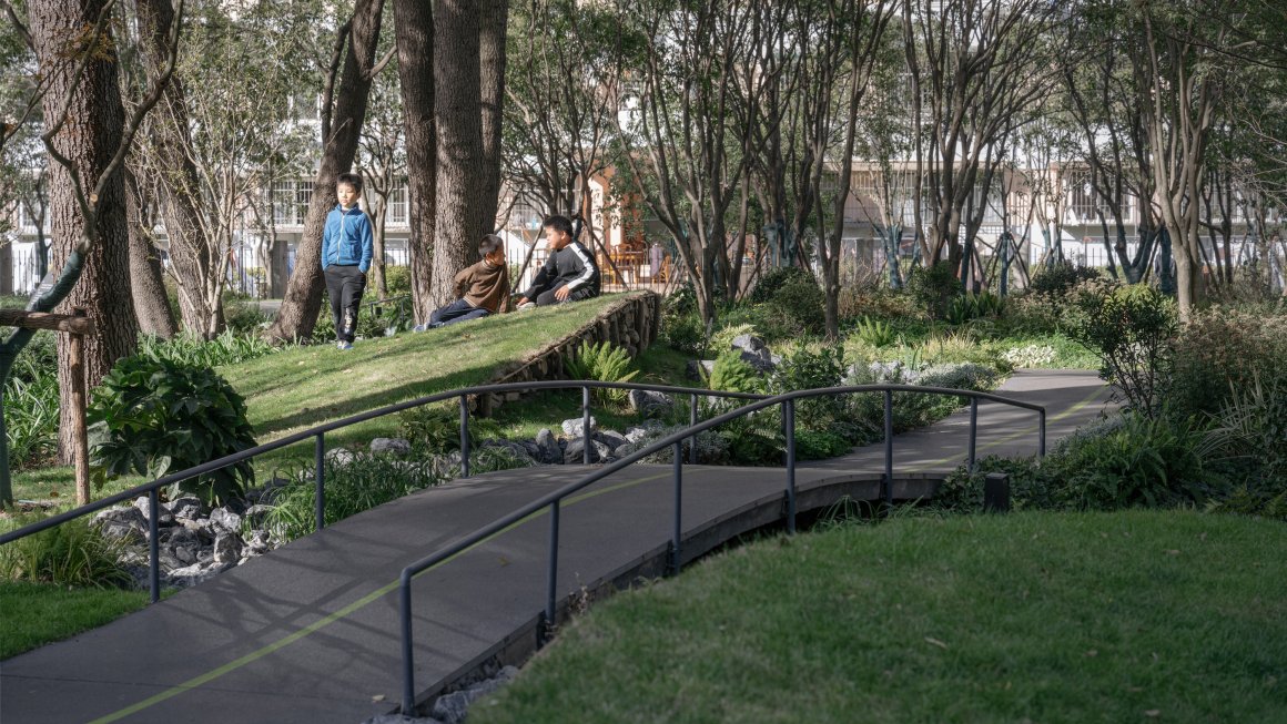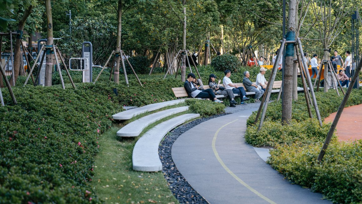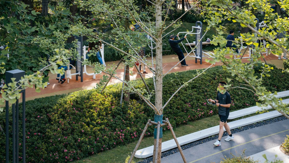 ▽有序安置在林间的健身场地与绿化景观 @CreatAR Images