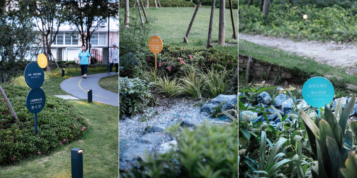 在自然生境式雨水花园沿线,我们将“观果生境”、“芳香生境”、“药用植物生境”、“岩石生境”植入林下空间,在形成不同类型的植物微生境的基础上,丰富了林下漫步游赏的体验与科普内涵。同时,结合地形整理,设计利用现场回收建筑废料(砖、石等)与植物修剪产生的枝条进行生态型整体地景营造,将“昆虫旅馆”、“本杰士堆”结合在整地地景中,围绕自然生境式雨水花园与水源地式雨水花园做更完整的系统布局,为更立体的公园微生境营造打好基础。与自然生境式雨水花园、艺术地景式雨水花园以渗透为主不同,水源地式雨水花园是具有临时积蓄雨水功能的下凹式林下空间,与临近区域新增的果树一起为鸟类提供水源、食物源。尝试通过自然绿色的保护与更完整的公园生境系统建构,在提升整体街区生态环境容量的同时,以整体绿色地景营造的方式将生境感知与生态科普转化为更直观的使用者游观体验。