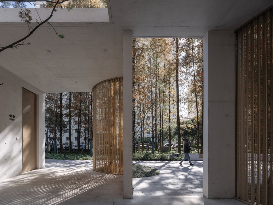 田林公园用地可以被理解为是由一大一小两个矩形构成,东侧面积较小的矩形空间在空间上相对独立,改造前是由水杉林围合下的存在安全隐患的硬质活动场地为主。场地北侧的敬老院要求相邻空间相对安静,同时公园更新后也需要一定的管理服务设施,因此我们决定在不破坏水杉林的前提下,利用现状硬质场地“嵌入”一处包含公园问询管理、公共卫生间等功能的游客服务中心(“林隐轩”3)为居民和游客提供服务。