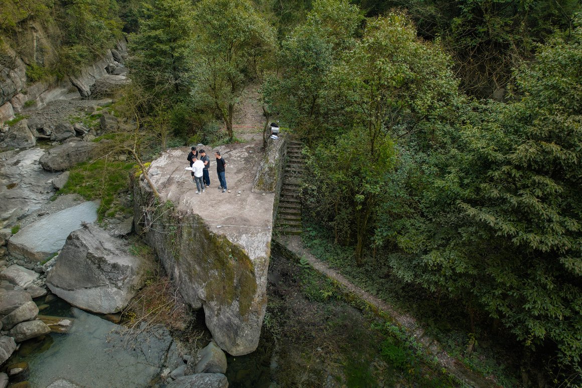“石阶”由十片叠拼的岩石构成。野外叠石的艺术在中西文化中被赋予不同的名称与寓意,却展现了相同的力量与平衡之美、自然与人工之巧。三片叠石自溪边沿着一侧山壁向上,落于石台平面,余下七片继续层叠向上,顺着巨石的边界水平错动,直至第九片止于巨石崖壁,第十片顺势微微悬挑。由于每一片岩石之间的高差约为60厘米,为了方便行走,我们从石料市场选取了一些方整的原石作为踏步,在石阶顶面串起一条路径,使人在行进中与远山、岩壁、峡谷、溪流、树林建立丰富的视觉联系与感知。