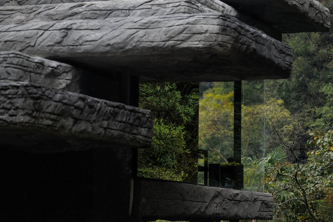 The construction the Drifting Stones adopted an artificial stone approach given the constrains by its site conditions. The design used a steel framework to shape the structure, with a heavy cement surface poured over it. Gound local stone powder was mixed into the cement exterior to harmonize the building with the surrounding rocks. We also invited Local artists to guide our workers in chiseling stone-like textures into the cement surface, echoing the patterns of the rock cliffs. Within the raw, rugged natural textures, modern elements like glass, mirrors, and metal were incorporated in the interior design. At the same time, deliberate contrasts and suspensions were introduced through thoughtful details—such as the raw stone handle on the glass door of the Stone Steps and the stainless steel handle on the stone door of the Stone Pavilion—adding layers of tension and dialogue between the natural and the modern.