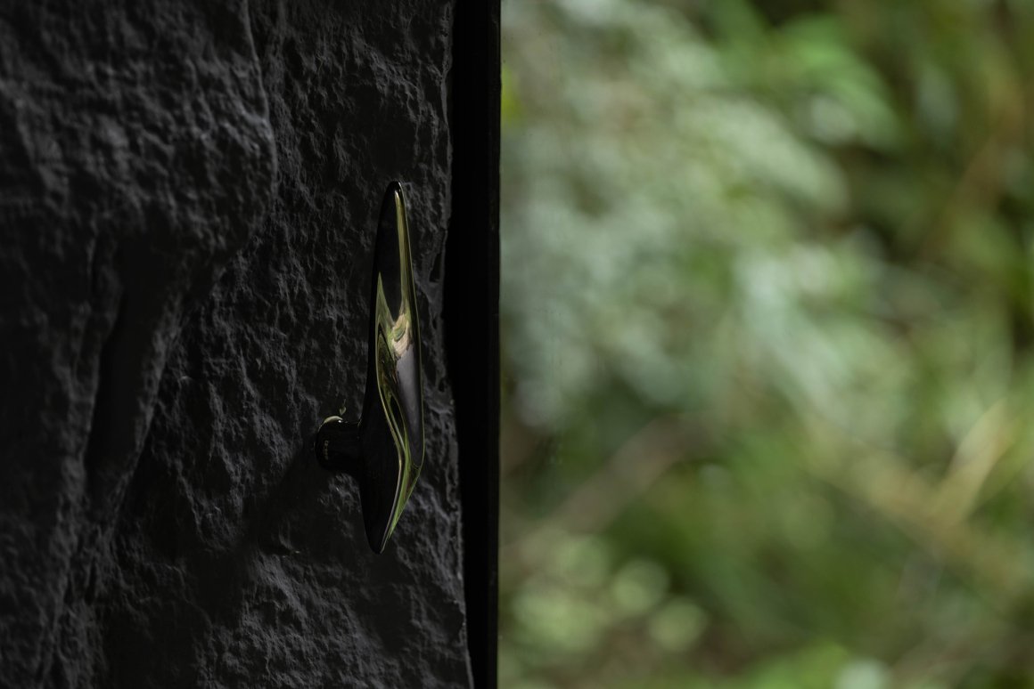 石舍的建造受到了场地施工条件的限制,而最终采取“人工造石”的方式。设计利用钢结构框架搭建整体形式,用水泥浇筑出厚重的表面而成。我们在水泥表皮中混入当地石材研磨成的石粉来统一建筑和周边岩石的色彩,并请当地艺术家现场指导工人在水泥表皮上凿出石纹呼应岩壁。在原始粗犷的自然肌理中,玻璃、镜面、金属等精致的现代元素,以谦逊的姿态被安置于恰当的位置,而又以细节的形式刻意创造冲突与悬置,如石阶玻璃门上的原石把手和石亭石门上的不锈钢把手。