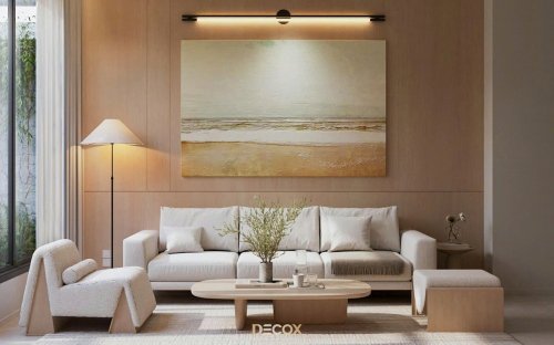 Opposite the wood-paneled wall is a built-in wooden cabinet system, stretching from the ground to the ceiling, contributing to balancing the space. Light-colored wood as the main material in the wall cabinet system shows natural beauty and elegance. Natural and artificial light sources are cleverly applied in bright white tones, creating a gentle, harmonious look in the overall space.
