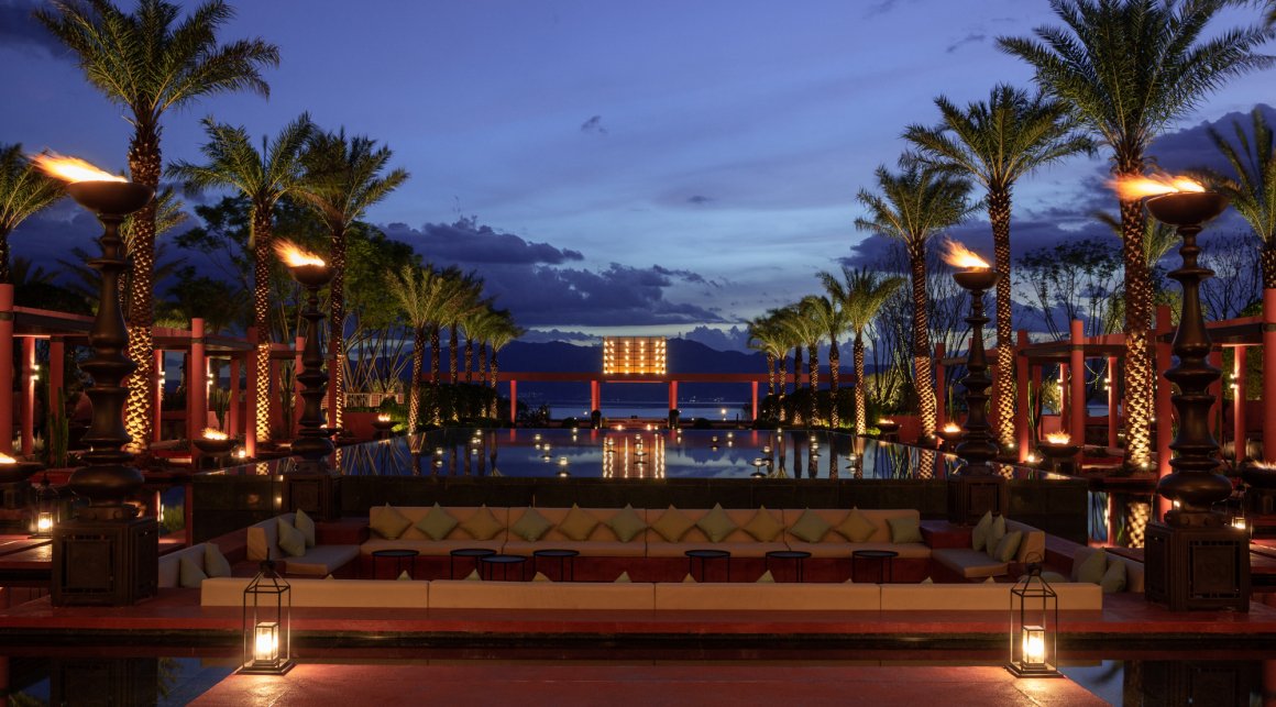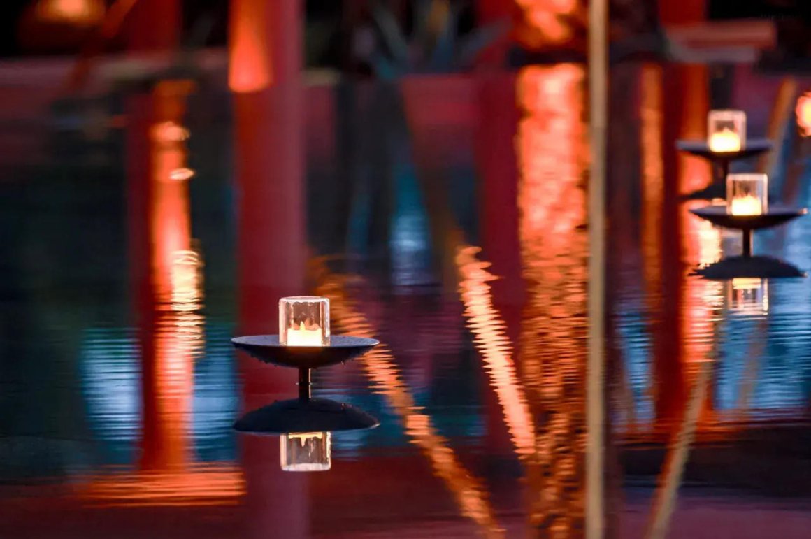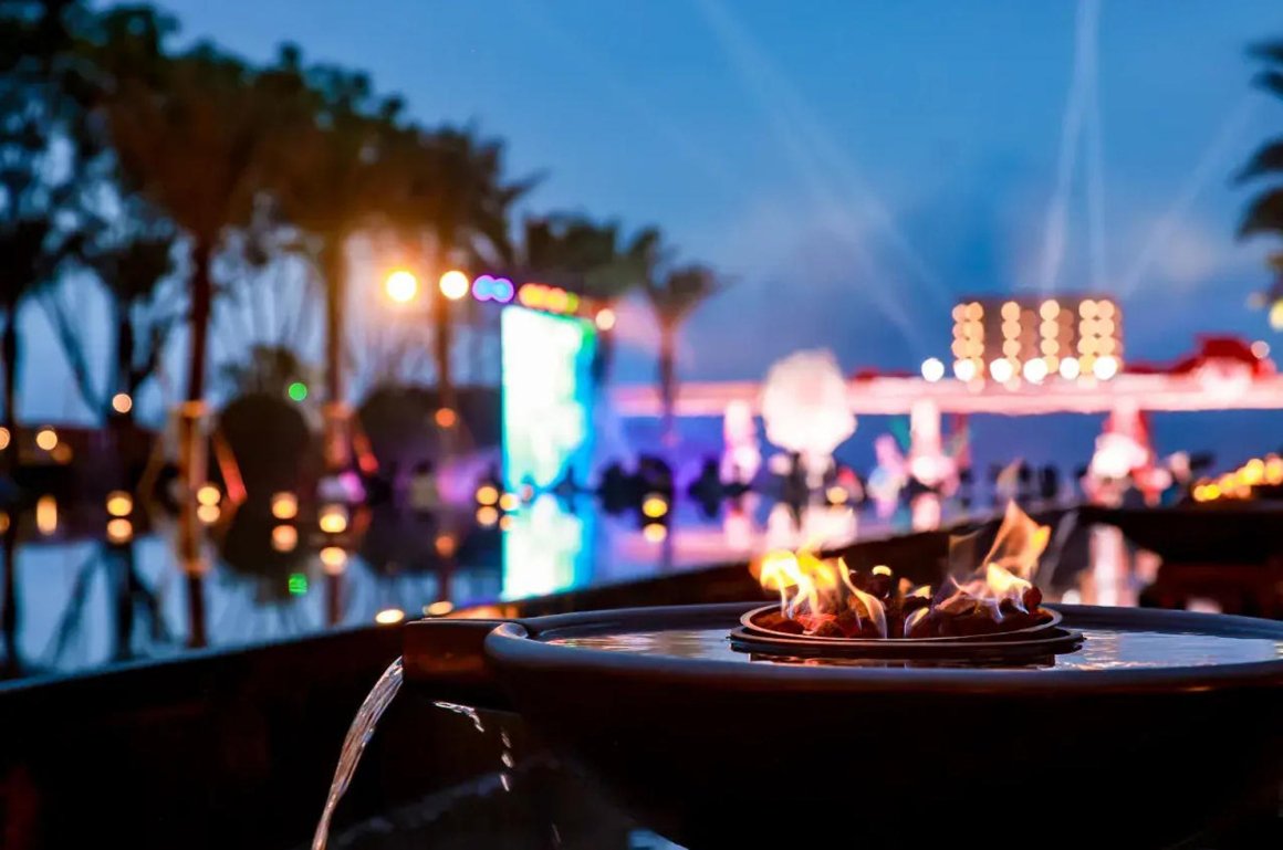 上方,无数小灯编织成灯塔意象,既是视觉的焦点,也是精神的象征。每日定时点亮,如同湖畔的守望者,讲述着光与时间的故事。中庭水面上,3米高的火柱与两侧序列排列的火盆共同构成每日的点火仪式——火焰跃动、灯光渐明,一场原始与现代交融的典礼,唤醒人们对自然力量的敬畏与共鸣。