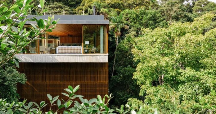 Rising from the lush canopies of Brazil‘s forested coastline, DB Arquitetos’ Casa VJC Iporanga offers a serene escape from São Paulo. Conceived as a summer retreat, the contemporary dwelling is hidden among its natural surroundings to become a haven for relaxation and connection with nature. Architect David Bastos faced the challenge of integrating the house into the steeply sloping terrain while preserving the surrounding vegetation. Thus, the structure takes shape with five overlapping floors that adapt to the contours of the land. This unique layout inverts the traditional program, placing the private bedrooms on the lower levels for greater privacy, while the social areas on the upper floors bask in the treetop views and coastal panoramas. These lower spaces are all fronted by a facade of vertical Cumaru timber slats.