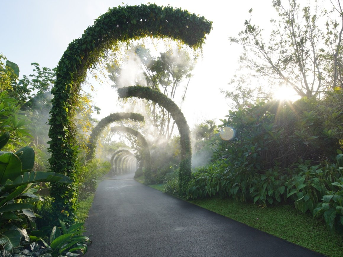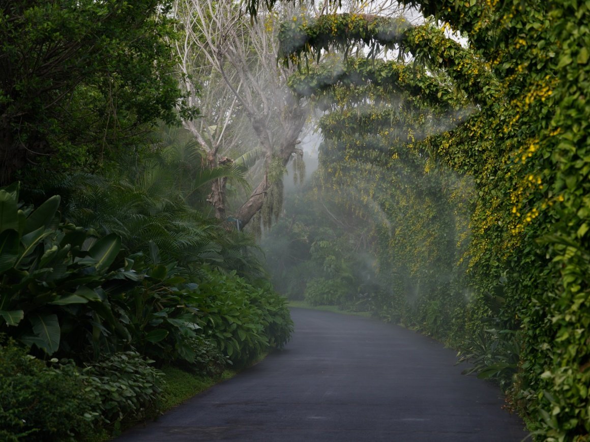 Light and shadow intertwine, transforming the trellis into a living painting where nature and art converge. Epiphytes are dotted between the trellises, as if time has stopped here.