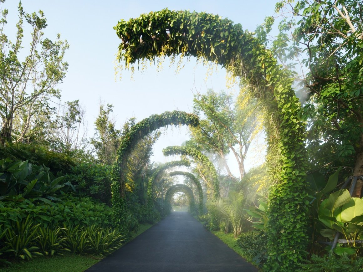 设计策略:以“自然共生”为设计理念,结合光影艺术与生态附生植物,打造多层次空间体验。通过廊架结构、透光材质与植物交织,形成动态光影效果,营造出人与自然互动的沉浸式场景,兼具艺术性与生态价值。