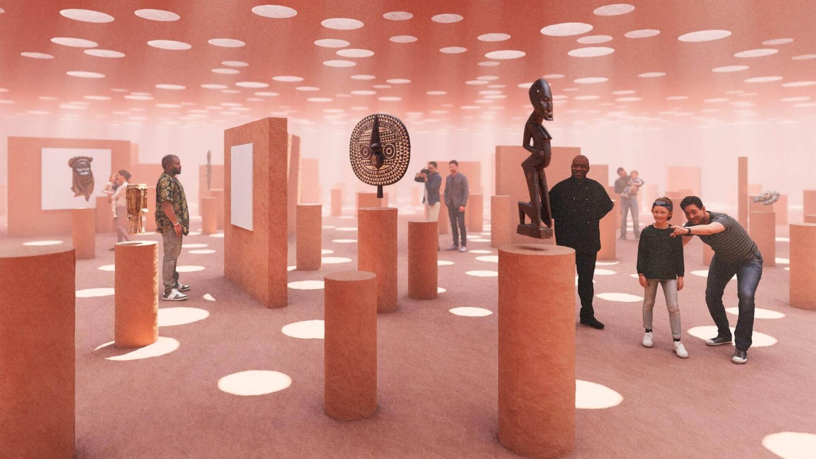 Kéré’s helical, experiential design evokes Frank Lloyd Wright’s Guggenheim Museum, in that visitors (via the click of a mouse or tap of a screen) ascend a gently sloped walkway to observe the objects on display.