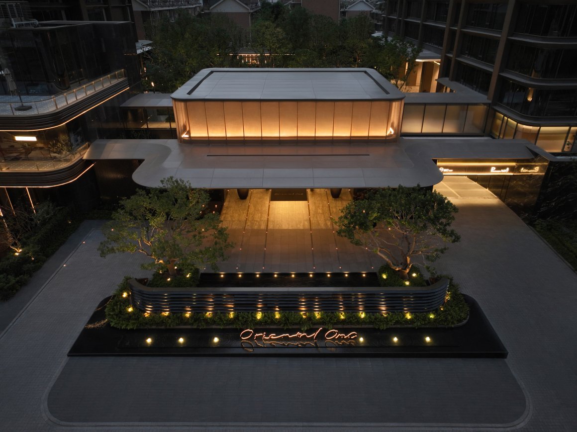 入口处约8米悬挑雨篷提升了门庭前场的气势,展现了高门大户的尊贵气度。雨篷下,双曲线金属叶片与定制灯具的光晕交织,营造出温暖而轻盈的归家氛围。